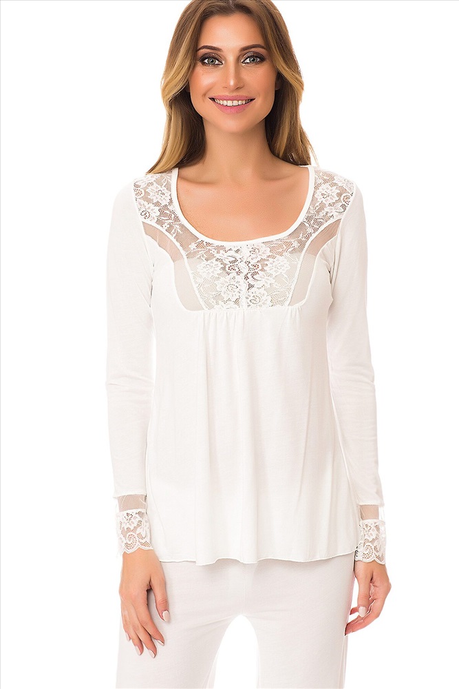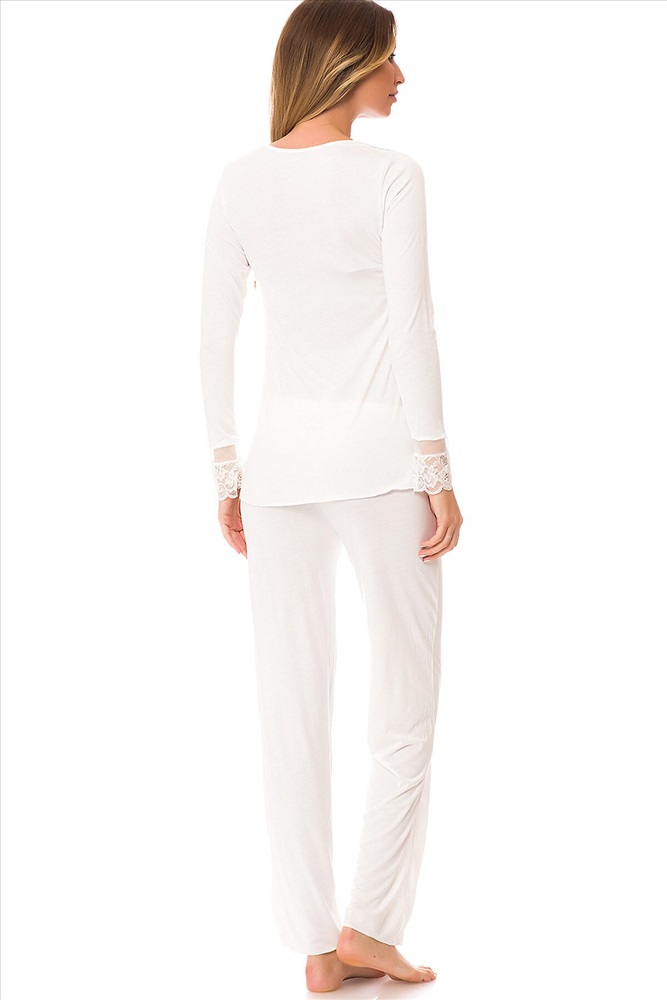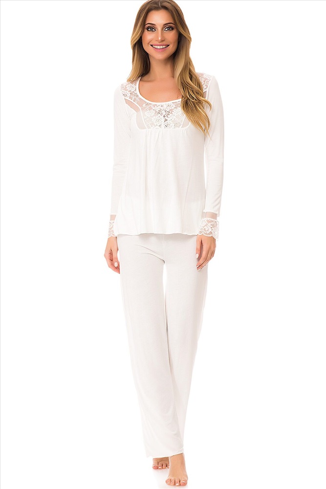 Комплект из трикотажных брюк и джемпера с длинным рукавом и округлым вырезом горловины.