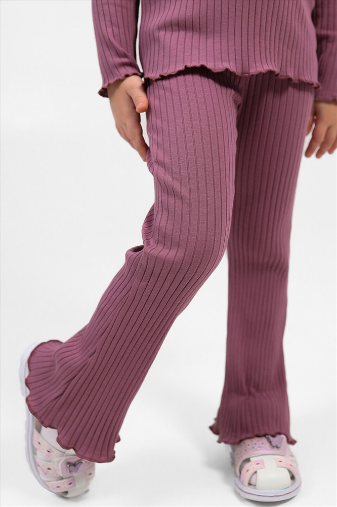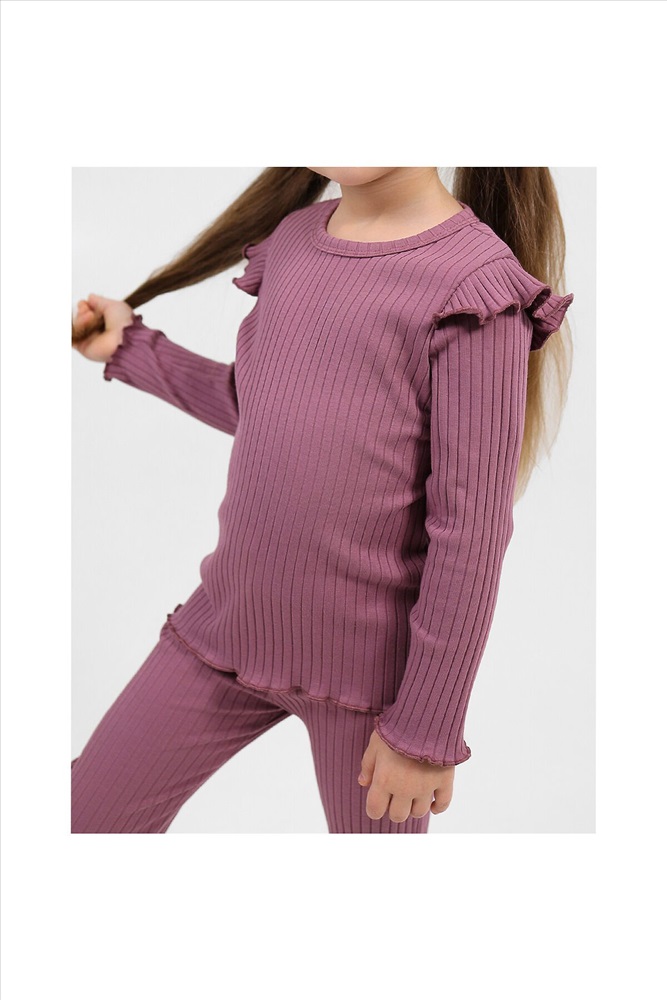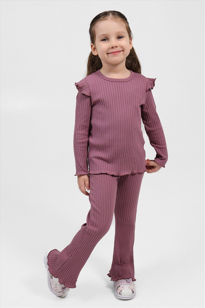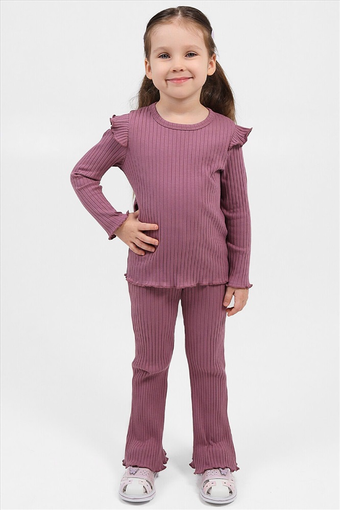 Комплект для девочки. Удобные брюки на резинке, слегка расклешенного кроя. Джемпер с длинными рукавами и рюшами на плечах.