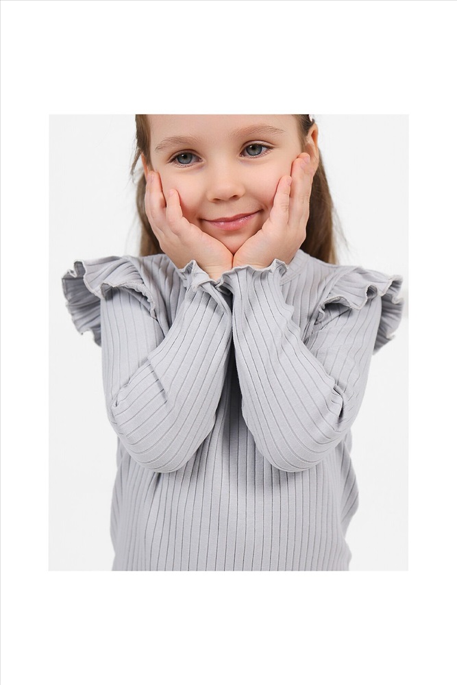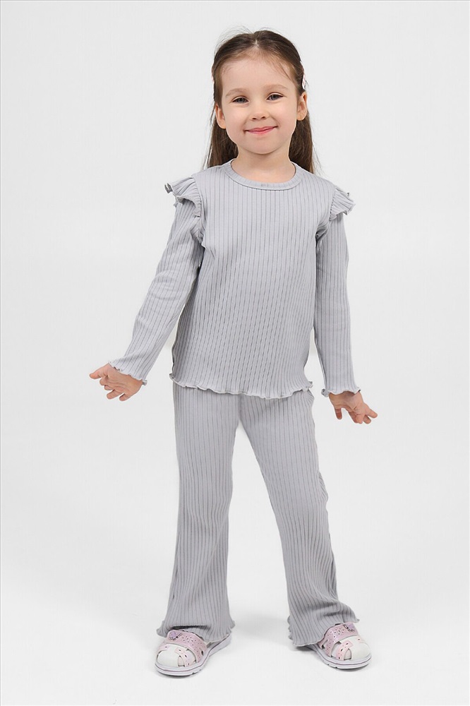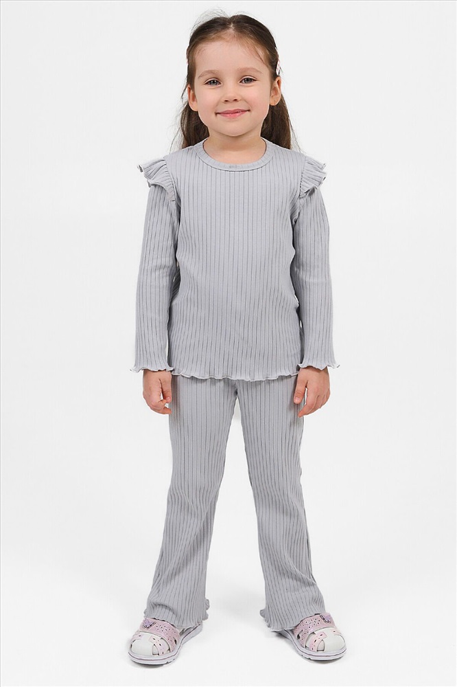 Комплект для девочки. Удобные брюки на резинке, слегка расклешенного кроя. Джемпер с длинными рукавами и рюшами на плечах.