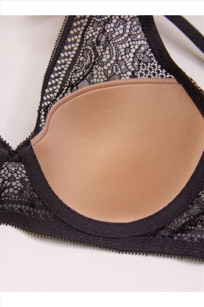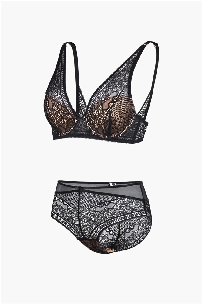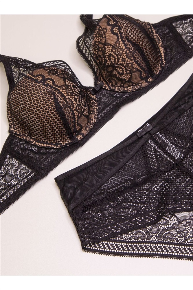 Комплект нижнего белья от торговой марки Индефини. В комплекте бюстгальтер и трусики. Бюстгальтер из полиамида, черного цвета, из кружевной ткани, на косточках, с косточками по бокам, с небольшим Push-up, с обрамлением, на тонких лямках, лямки регулируются. Трусы-слипы из полиамида, черного цвета, из кружевной ткани, с обрамлением, на мягкой резинке, с высокой посадкой. К бюстгальтеру идут трусы слипы, размерами: 75B-S, 75C-M, 80B-M, 80C-L, 85B-XL.