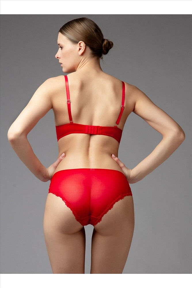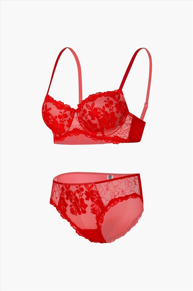 Комплект нижнего белья от торговой марки Индефини. В комплекте бюстгальтер и трусики. Бюстгальтер из полиамида, красного цвета, из кружевной ткани, с цветочным принтом, с кружевным обрамлением, на косточках, с боковыми косточками, с небольшим Push-up, на тонких бретелях, на широком атласном поясе, с застежками-крючками, бретели регулируются. Трусы-слипы из полиамида, красного цвета, из кружевной ткани, с цветочным принтом, с кружевным обрамлением, на мягкой резинке, средней посадки.