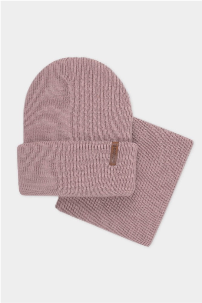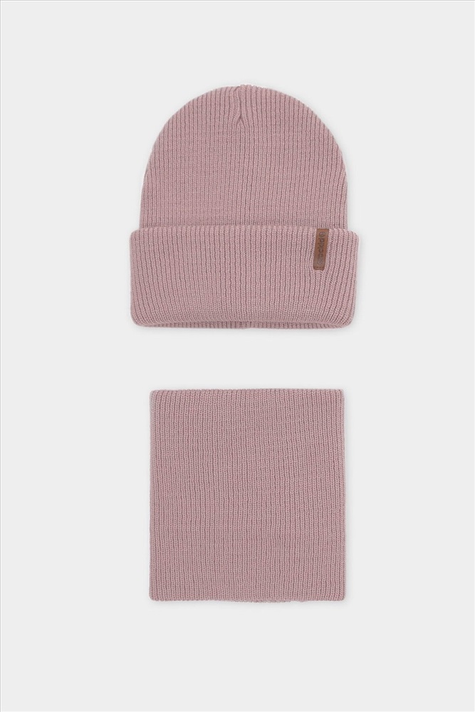 Комплект детский: шапка и снуд из полушерсти. Тёплая шапка с отворотом, украшена нашивкой из искусственной кожи. Снуд без отворотов вокруг шеи. Изделие сохраняет форму и стойкий цвет после многочисленных стирок.