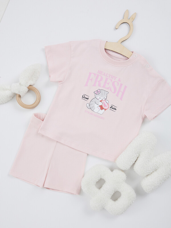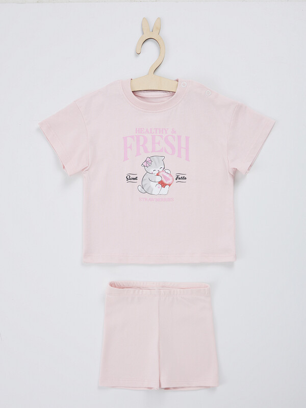 Джемпер выполнен из трикотажного кулирного полотна 100% хлопок, 140 гр/м2, 180 см (SJ-10, SJ10-001.01.140). Джемпер прямого, свободного силуэта с короткими рукавами. Рукава втачные, низ обработан швом в подгибку на плоскошовной машине швом в подгибку. Перед и спинка цельнокроенные. Низ джемпера обработан швом в подгибку на плоскошовной машине. Горловина круглой формы. Обработана обтачкой из полотна рибана 1*1, 97% хлопок; 3% эластан, 230 гр, 165 см (R-59, R11-049.01.230). Шов притачивания обтачки по переду и спинке распошит. В плечевом шве застежка на 2 книпера 9мм. Шорты прилегающего силуэта длиной до колен. Шорты выполнены из кулирного полотна 95% хлопок; 5% эластан ,170 гр/м?, 180 см (Sj-6 ,Sj-009.01.170). К верху шорт притачивается резина 2 см на оверлоке, отгибается и отстрачивается на плоскошовной машине. Низ обработан швом в подгибку на плоскошовной 97% хлопок; 3% эластан Комментарии к товару
