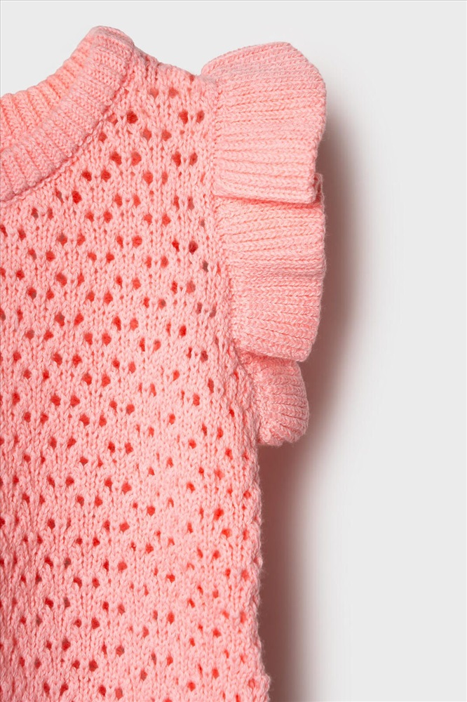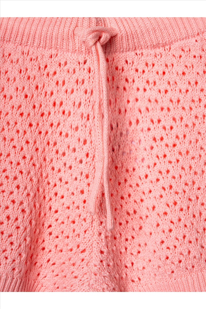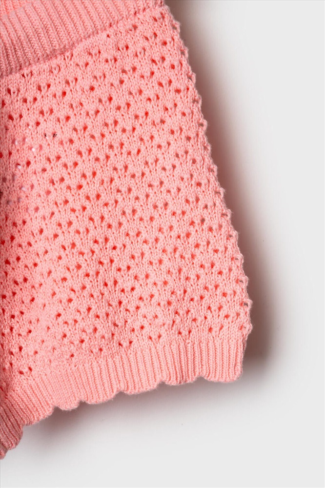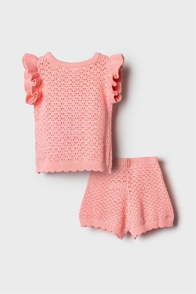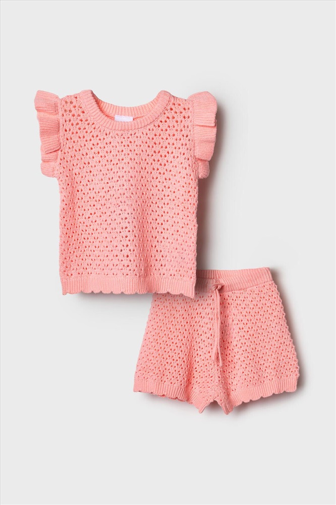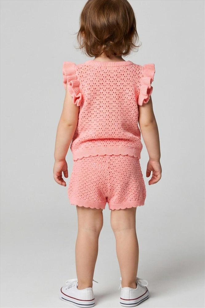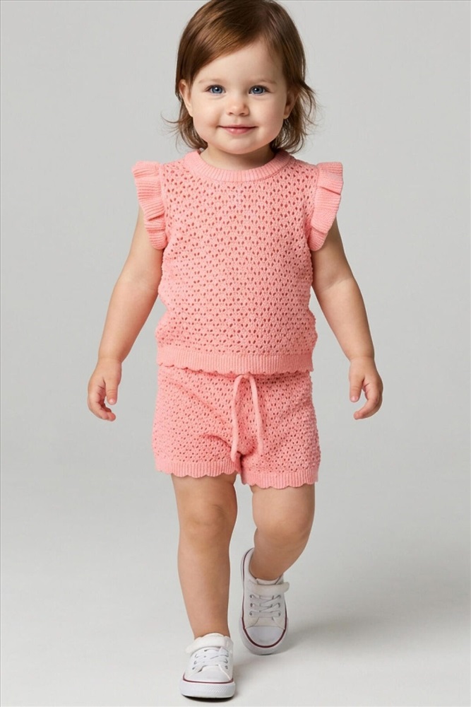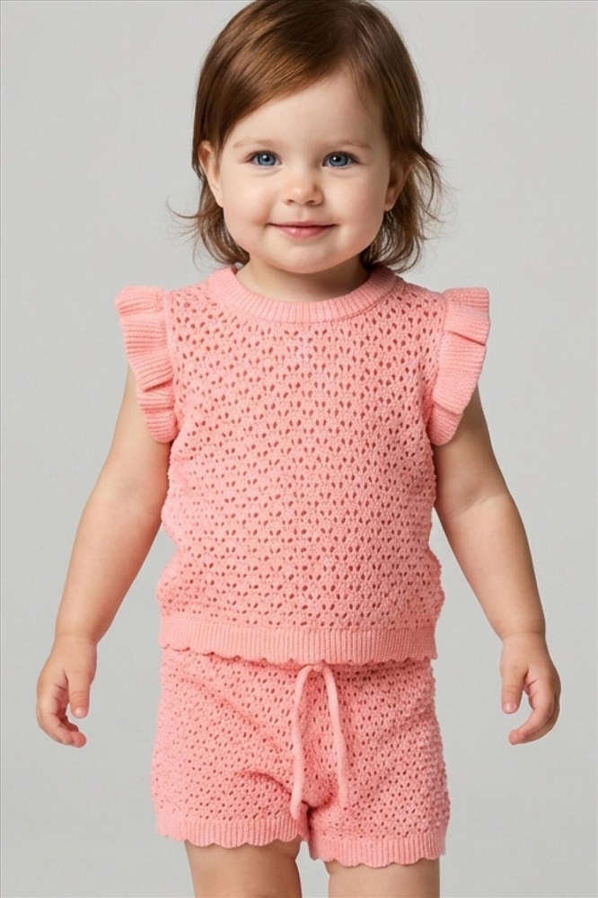 Нежный детский костюм для девочки. Состоит из футболки и шорт. Выполнен из мягкого вязаного трикотажа с ажурным узором, благодаря чему комплект выглядит легким и воздушным. Футболка имеет свободный прямой крой и круглую горловину. Проймы украшены декоративными крылышками, а низ оформлен волнообразным краем, что придает модели нарядный вид. Шорты свободного силуэта, с комфортным поясом на резинке и дополнительным шнурком для регулировки.
