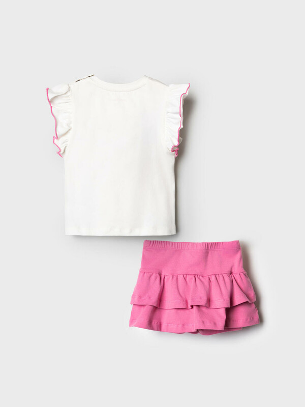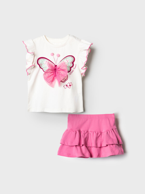 Легкий детский комплект для девочки. Выполнен из мягкого хлопкового трикотажа джерси, состоящий из футболки и юбки-шорт. Футболка прямого кроя с нежным принтом и декором из сетки. На плече застежка на кнопки для удобного переодевания. Рукава-крылышки. Пышная юбка на резинке с воланами, внутри имеет удобные шорты, что делает модель практичной для активного отдыха.
