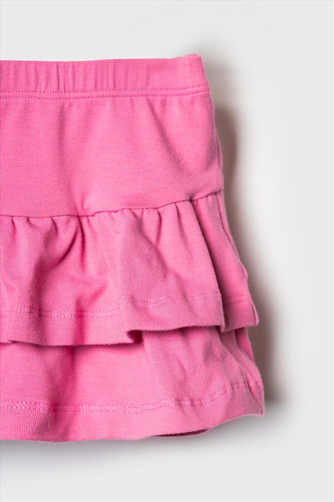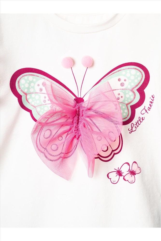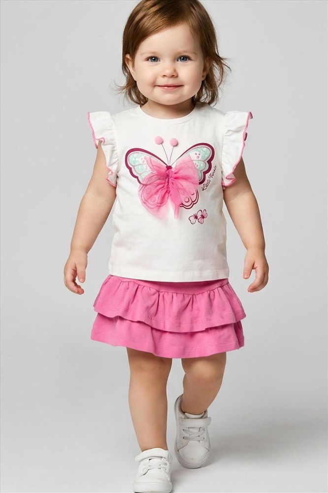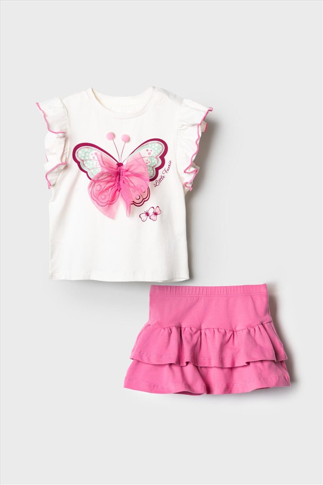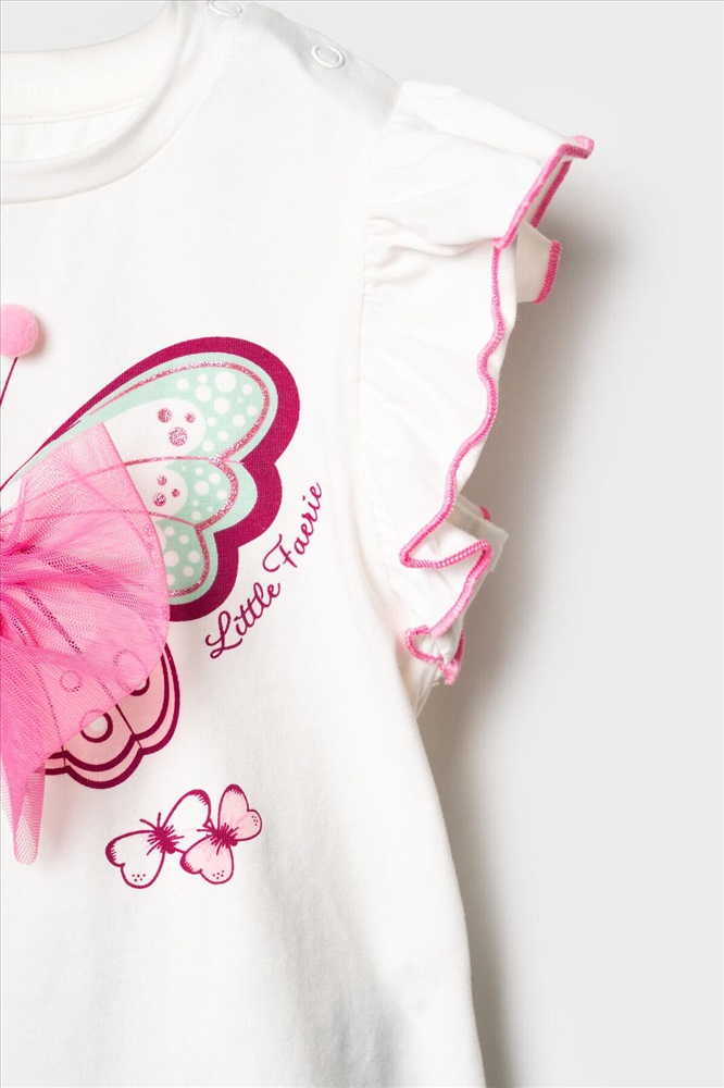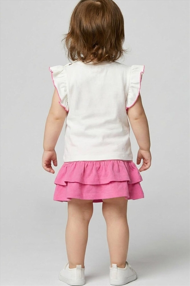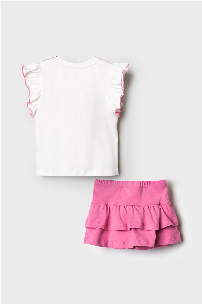 ID товара: 1240076 Состав: 95% хлопок, 5% эластан Сезон: Весна/Лето Легкий детский комплект для девочки. Выполнен из мягкого хлопкового трикотажа джерси, состоящий из футболки и юбки-шорт. Футболка прямого кроя с нежным принтом и декором из сетки. На плече застежка на кнопки для удобного переодевания. Рукава-крылышки. Пышная юбка на резинке с воланами, внутри имеет удобные шорты, что делает модель практичной для активного отдыха. Комментарии к товару