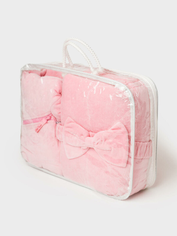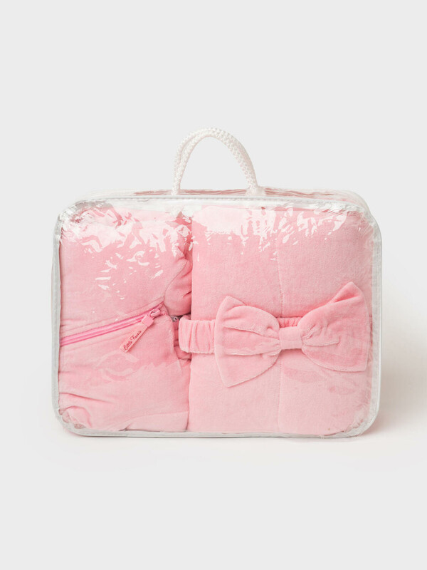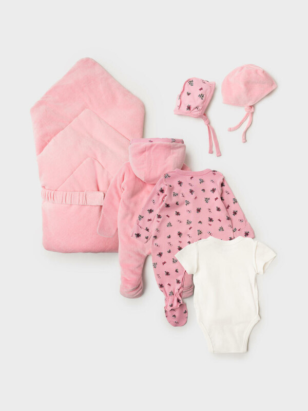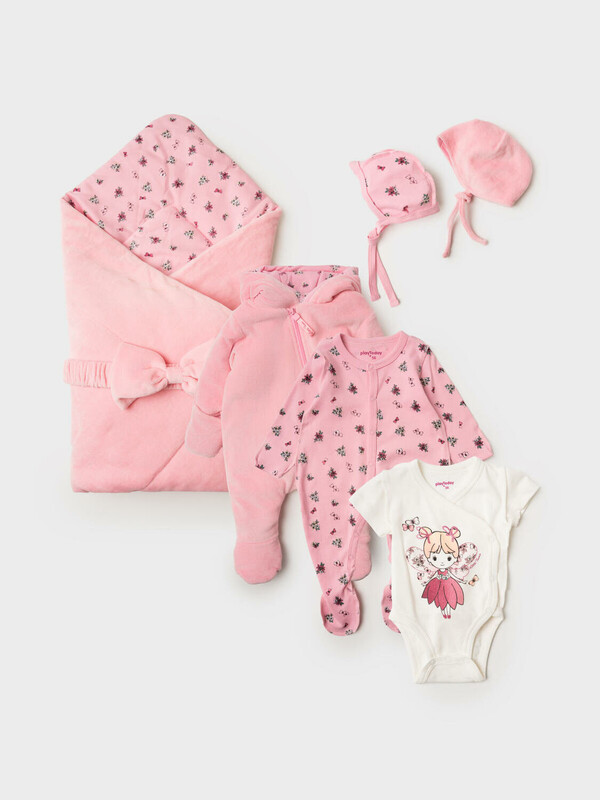 Комплект из шести предметов для новорождённой девочки. В него входят два комбинезона, боди с коротким рукавом, чепчик, шапочка и тёплый конверт-одеяло. Изделия выполнены в нежных розовых и молочных тонах. На боди и одном из комбинезонов размещён яркий принт с феей и бабочками, остальные элементы оформлены рисунком с бабочками. Утеплённый комбинезон имеет капюшон с подкладкой и удобную косую застёжку-молнию. Конверт украшен декоративным бантом. Боди, чепчик, комбинезон выполнены с наружными швами для дополнительного комфорта малышей. Боди с двумя рядами кнопок, растет вместе с малышом.