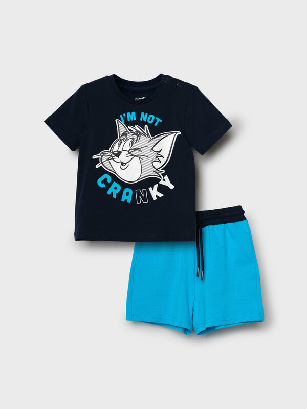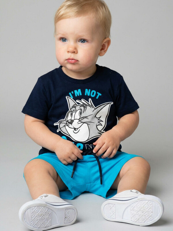 Детский костюм для мальчика. Состоит из футболки и шорт. Выполнен из хлопкового трикотажа. Футболка прямого кроя, с коротким рукавом. Яркий принт с любимыми персонажами "Том и Джерри". На плече застежка на кнопки для удобного переодевания. Шорты свободные, с эластичным поясом и шнурком для регулировки посадки.