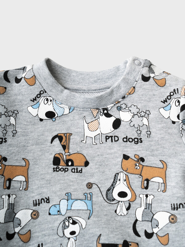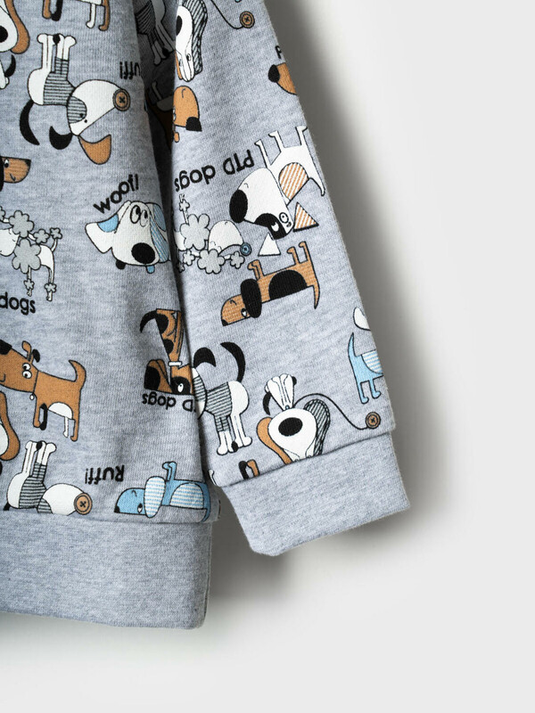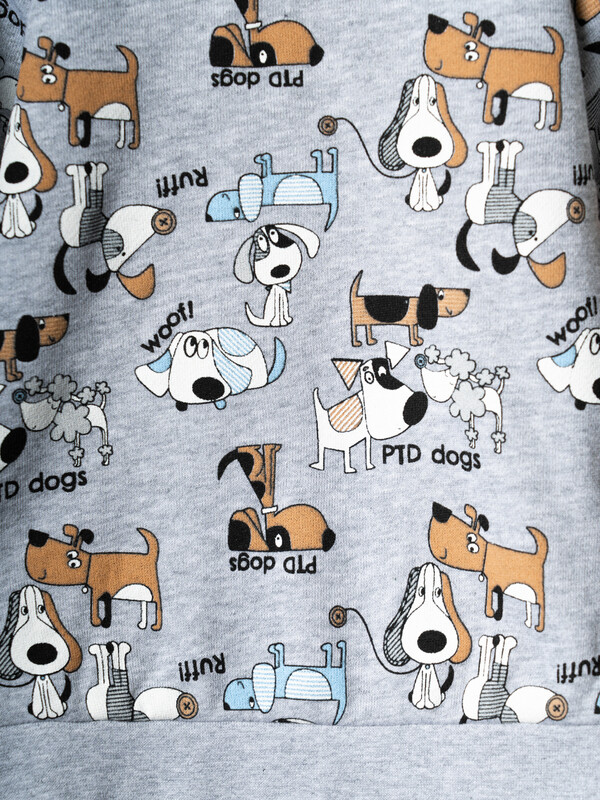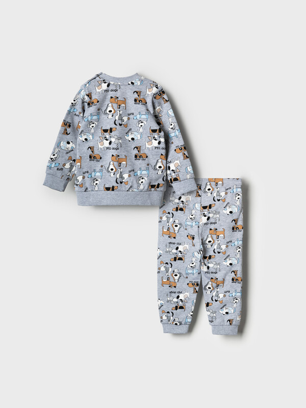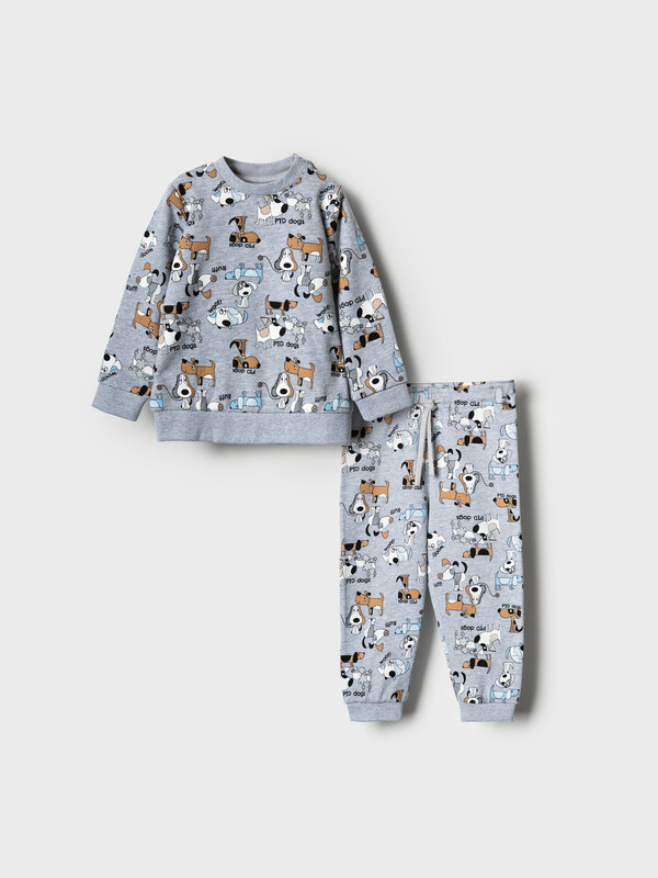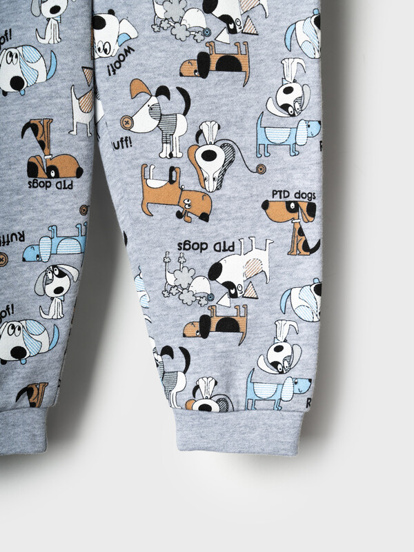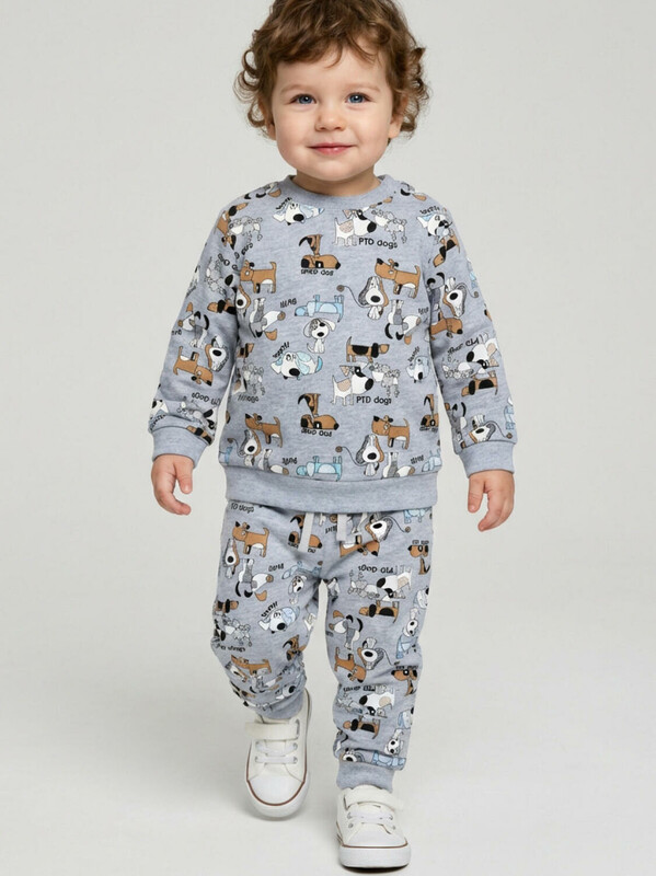 Детский спортивный костюм для мальчика. Комплект выполнен из хлопкового футера и состоит из свитшота и джогеров на резинке. Толстовка прямого кроя с милым принтом. Манжеты и пояс выполнены из эластичного трикотажа, благодаря чему изделие хорошо держит форму. Брюки джоггеры — комфортные, с эластичным поясом и шнуром для регулировки посадки. Низ штанин собран на резинку.