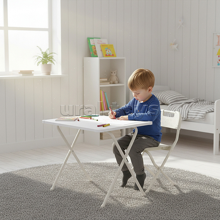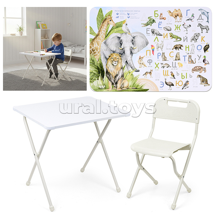 Размер изделия: - стол 60 х 45 х 58 см, - столешница 60 х 45 см, - стул 36 х 35 х 61 см, - сиденье 26 х 29 см, - высота до сиденья 35 см Вес: 5,8 кг. За столом можно: - кушать, - играть. - учиться. Особенности: - съемная двусторонняя ламинированная накладка на столешнице, на которой можно рисовать маркерами на водной основе; - обучающий материал на накладке; - крючок для сумки или рюкзака; - зажим-подстаканник; - пластиковые колпачки на опорах против скольжения; - легкое сложение, компактное хранение. Яркий комплект мебели поможет обустроить рабочее место ребенка, где он сможет рисовать, читать и писать, развивать творческие навыки и логическое мышление. Материал: пластик, металл. Возраст ребенка: от 3 до 7 лет.