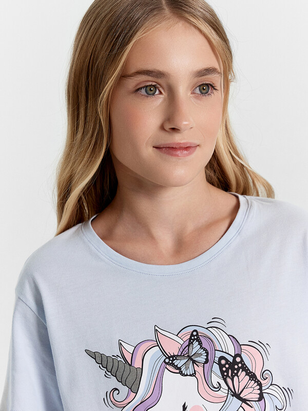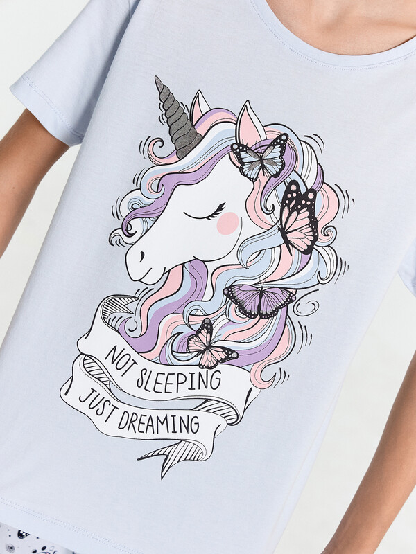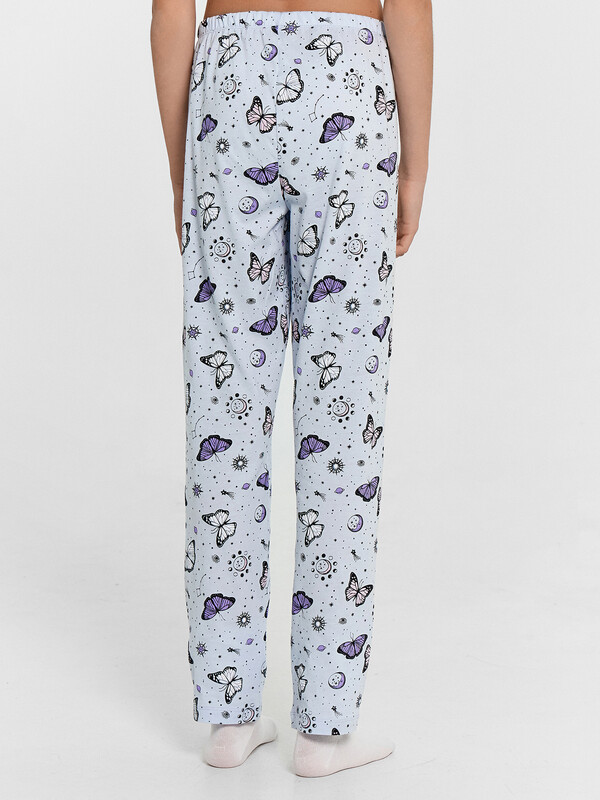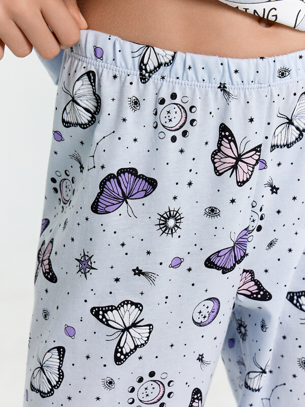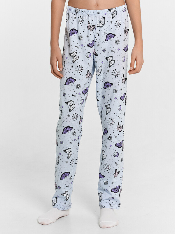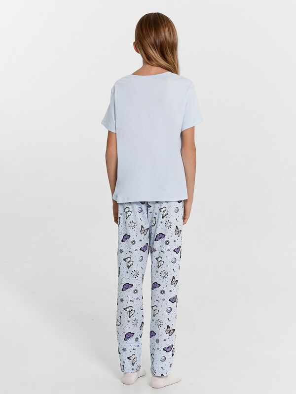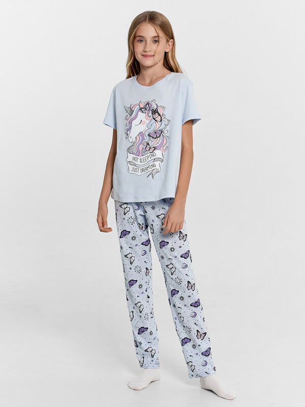 Уютная и красивая пижама для девочек. Выполнена из хлопковой трикотажной кулирки. В комплект входят футболка и брюки. Футболка с круглым вырезом, короткими рукавами. Свободный силуэт и классическая длина обеспечивают комфорт. Брюки длинные, слегка заужены к низу, с тесьмой в поясе. Широкий размерный и цветовой ряд. Комфортно и очень стильно!