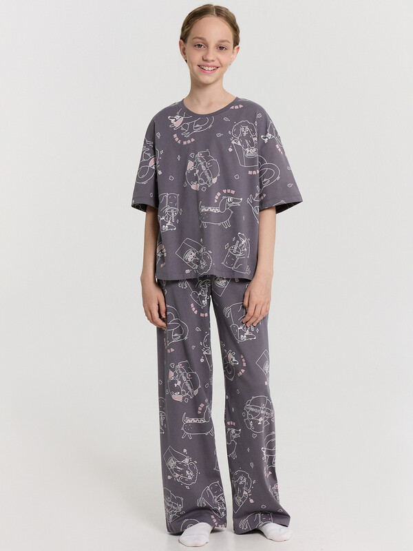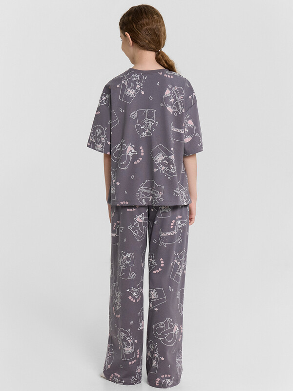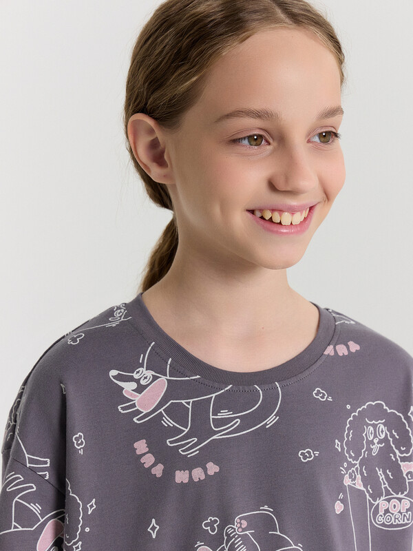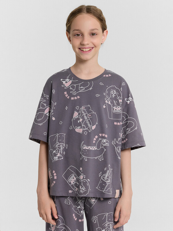 Футболка свободного силуэта. Горловина круглой формы, обтачка из рибаны. Рукава втачные свободные, линия плеча слегка спущена. Низ рукавов и футболки в подгибку.