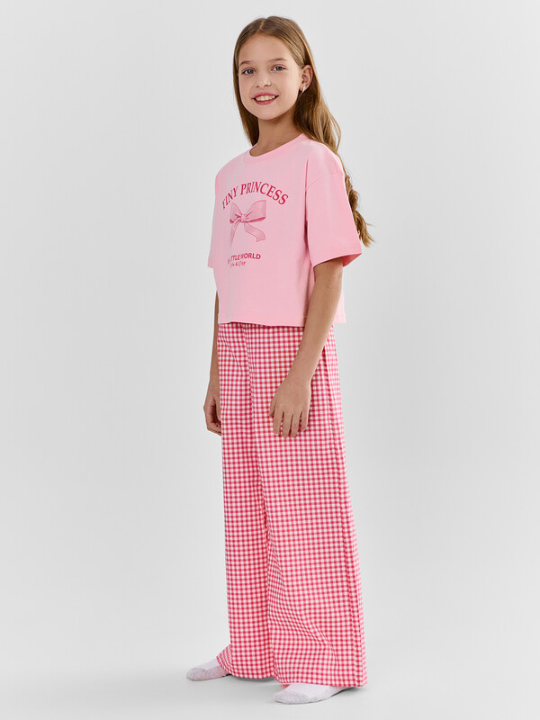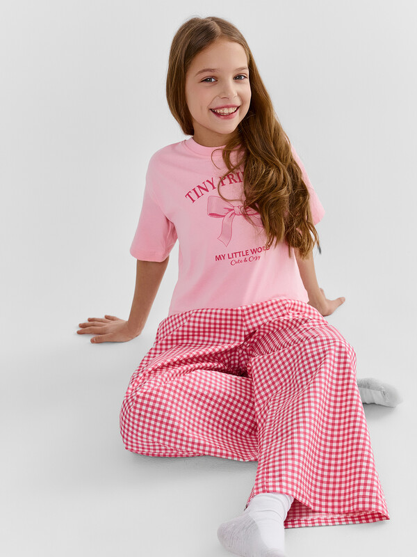 Футболка свободного силуэта. Горловина круглой формы, обтачка из рибаны. Рукава втачные свободные, линия плеча слегка спущена. Низ рукавов и футболки в подгибку.