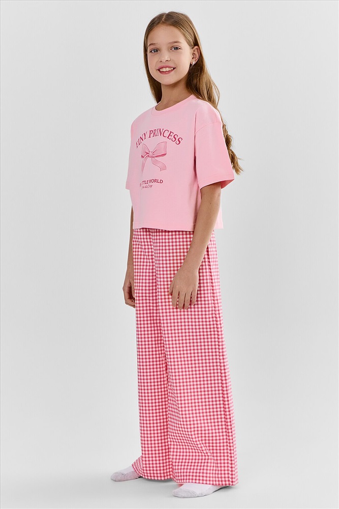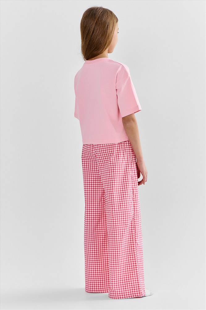 Футболка свободного силуэта. Горловина круглой формы, обтачка из рибаны. Рукава втачные свободные, линия плеча слегка спущена. Низ рукавов и футболки в подгибку. Брюки свободного силуэта. Пояс цельнокроеный внутри с резиной 40RV. Низ брюк в подгибку.