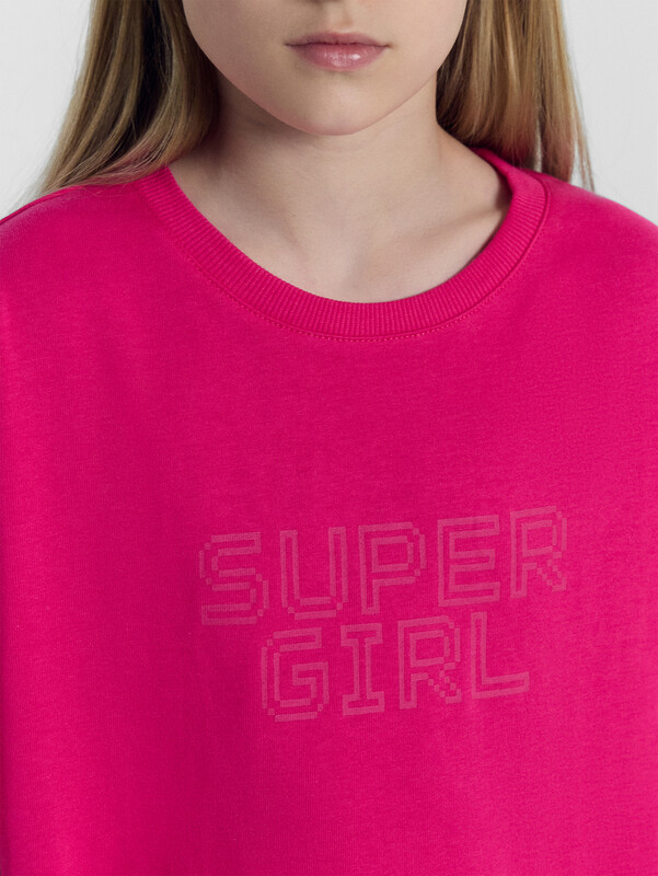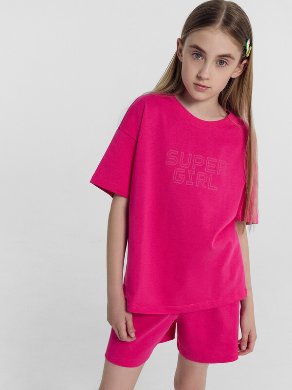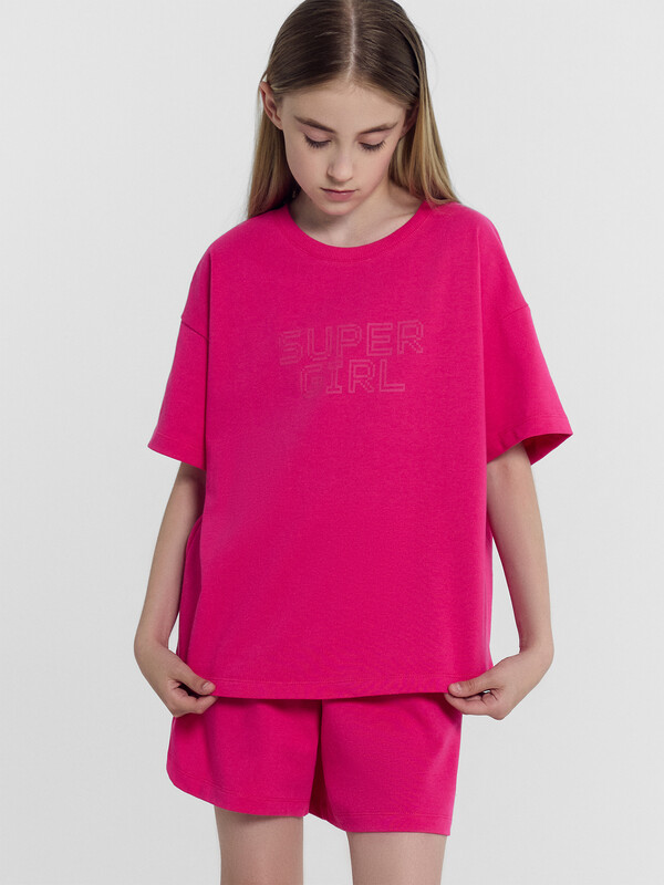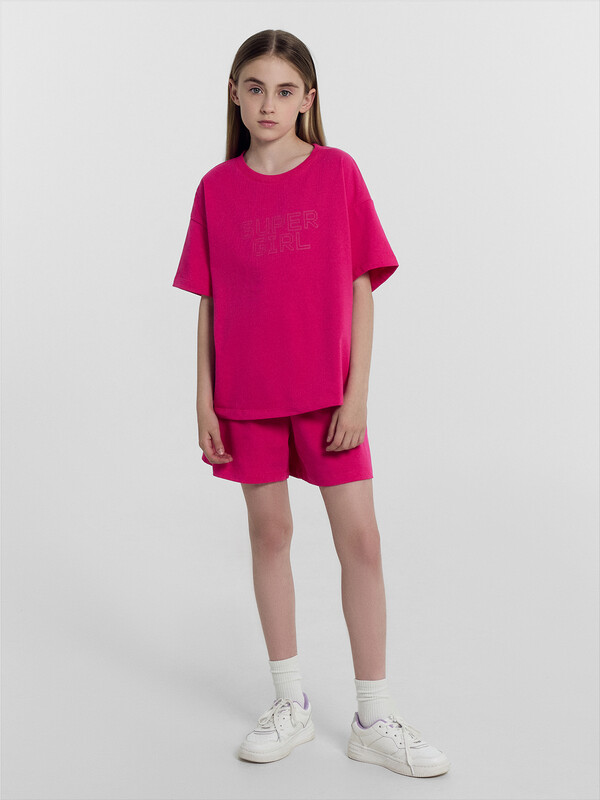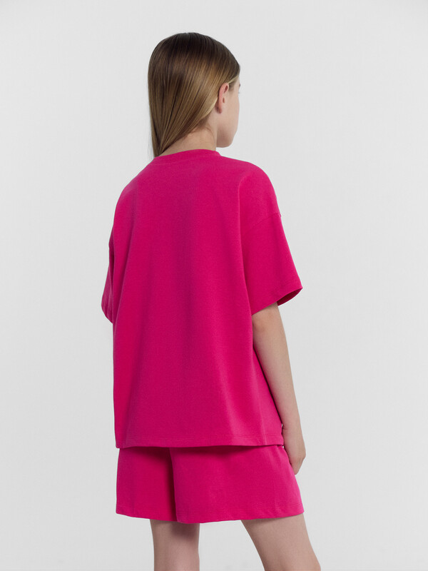 Футболка свободного силуэта. Перед и спинка цельнокроеные. Длина до середины бедра. Рукав втачной, короткий. Горловина круглой формы, обтачка из рибаны. Низ изделия и рукваов обработан на 2-х игольной плоскошовной машине швом в подгибку.