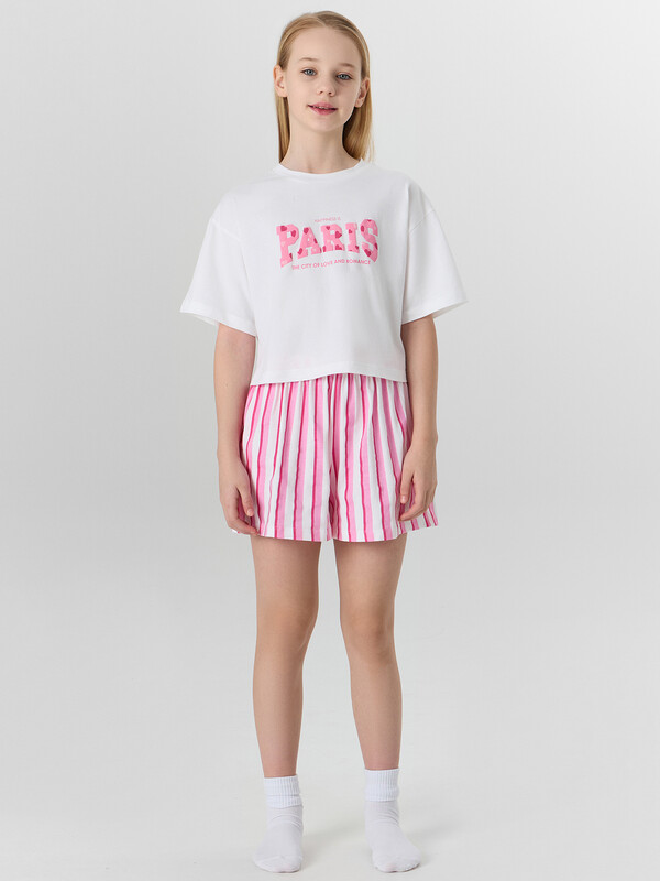 Футболка свободного кроя со слегка спущенным плечом и округлой горловиной создает расслабленный силуэт, не стесняющий движений. Короткие шорты с поясом на эластичной резинке и боковыми карманами обеспечивают удобство и практичность во время игр или прогулок. Все края аккуратно обработаны для долговечности и аккуратного вида. Состав из хлопка гарантирует гипоаллергенность, экологичность и простоту в уходе, сохраняя форму и цвет после стирок. Этот комплект идеально подойдёт для активных игр, повседневной носки или отдыха на свежем воздухе, обеспечивая ребёнку комфорт в каждом движении. 100% хлопок Комментарии к товару