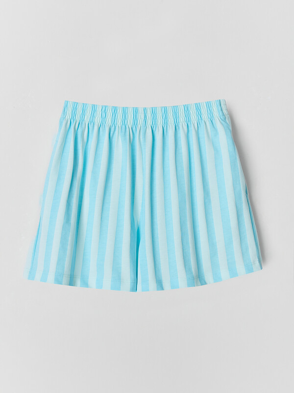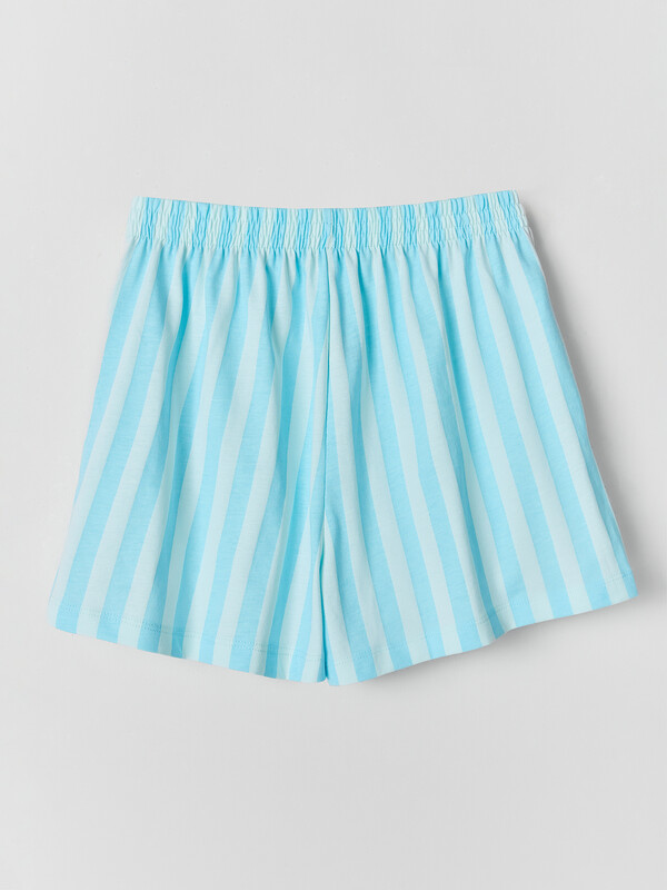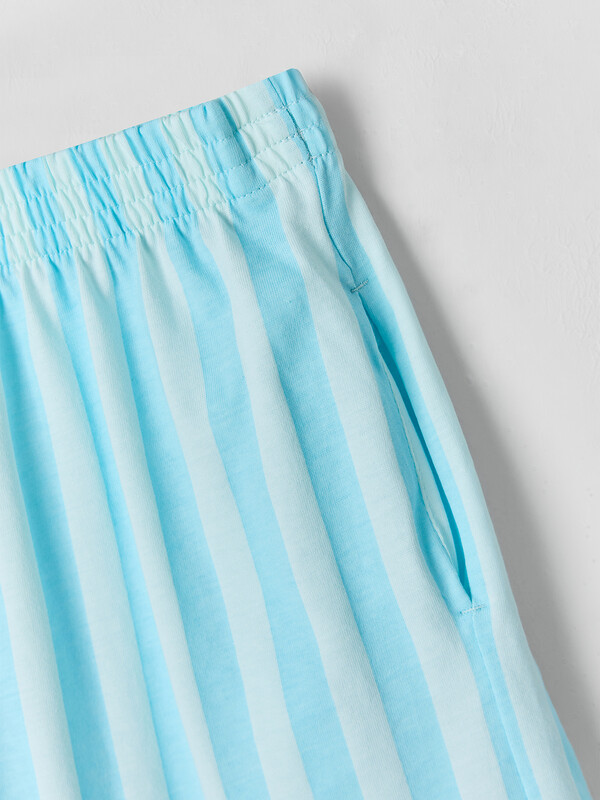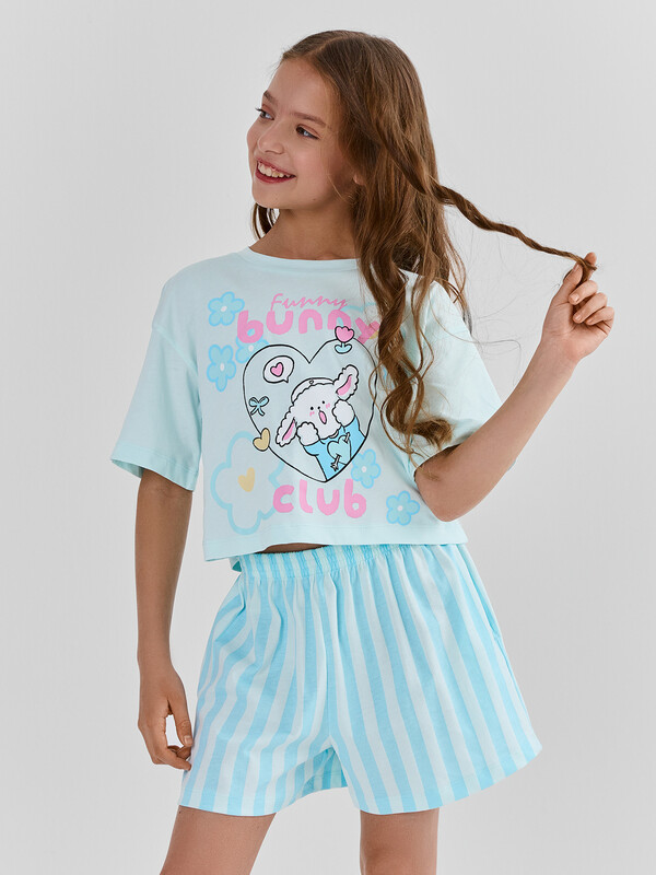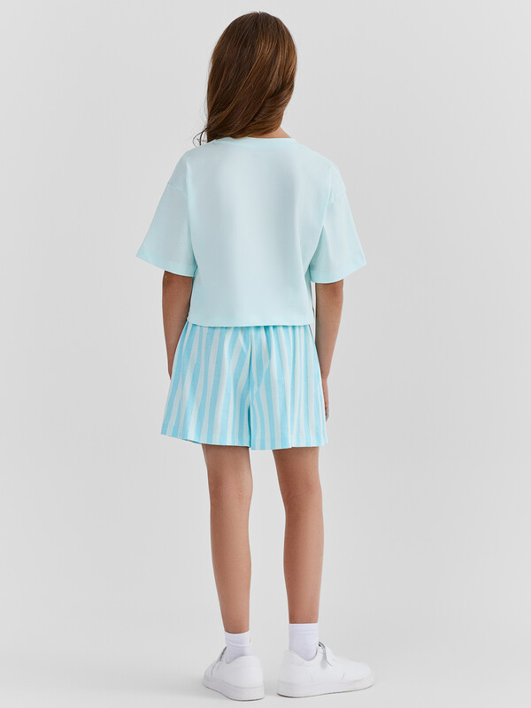 Футболка свободного кроя со слегка спущенным плечом и округлой горловиной создает расслабленный силуэт, не стесняющий движений. Короткие шорты с поясом на эластичной резинке и боковыми карманами обеспечивают удобство и практичность во время игр или прогулок. Все края аккуратно обработаны для долговечности и аккуратного вида.