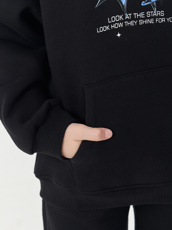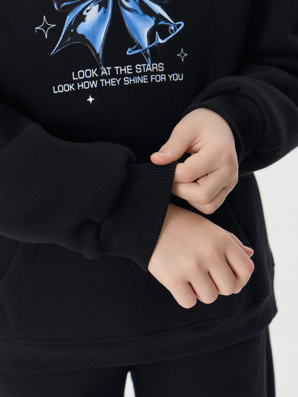 Худи для девочек, свободного силуэта (оверсайз), с капюшоном. Горловина округлой формы. Капюшон со средним швом, на подкладке из основного полотна. Шов втачивания капюшона закрыт хб тесьмой. Плечо спущено, рукав втачной длинный. По низу рукава отрезная манжета из рибаны. Пояс отрезной из рибаны, отстрочен. По переду карман кенгуру. Брюки для девочек, прямого силуэта. Пояс цельнокроеный с втачной эластичной тесьмой RV40. Пояс прострочен двумя отделочными строчками. По переду обработаны карманы в швах. Низ брюк обработан швом в подгибку на двухигольной плоскошовной машине.