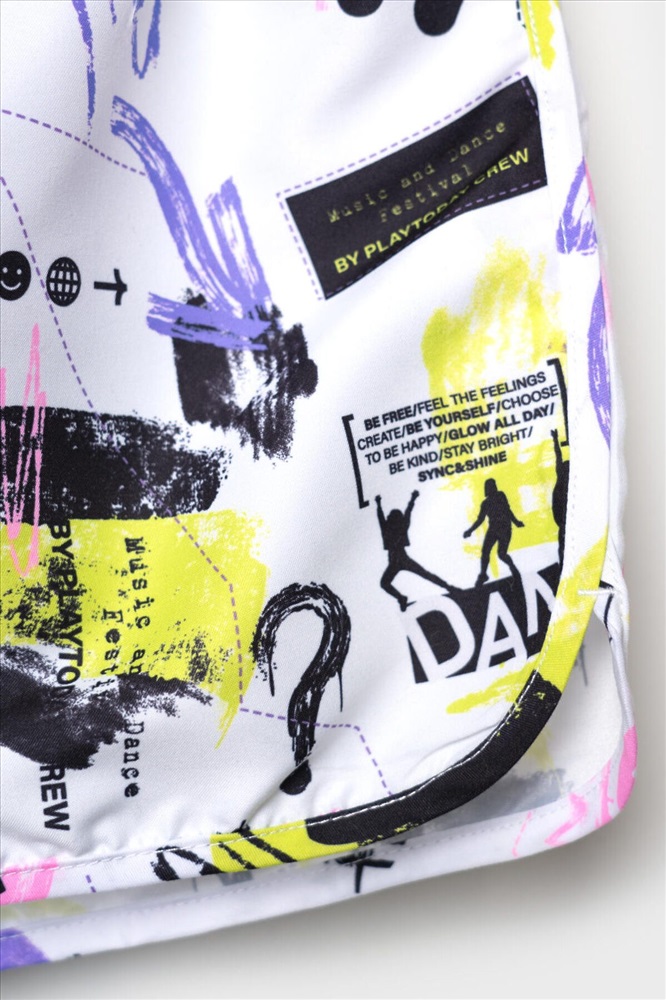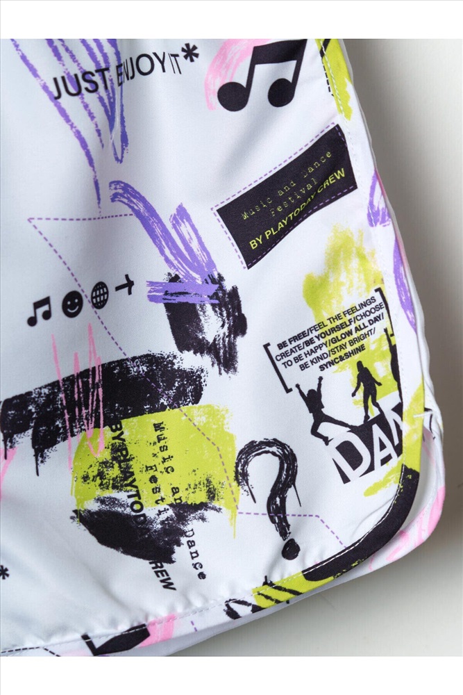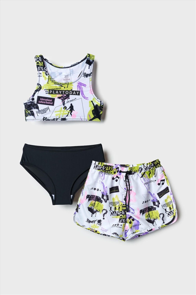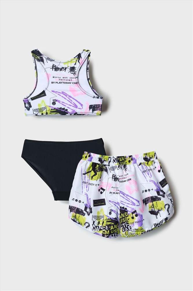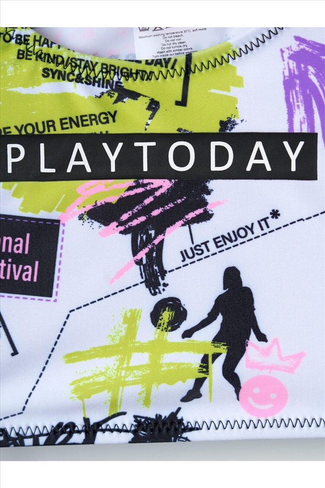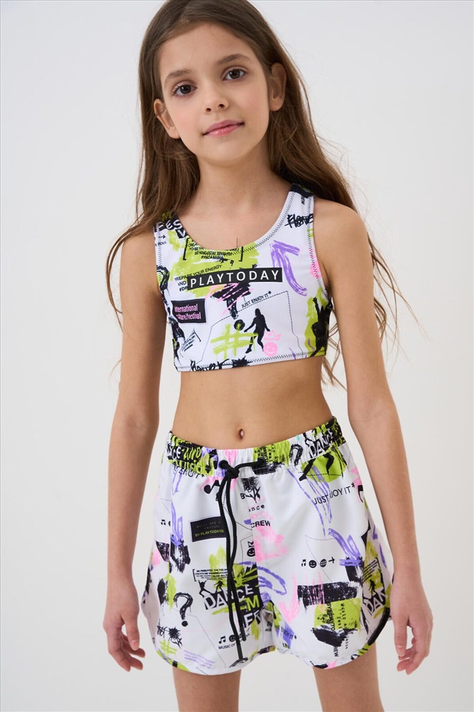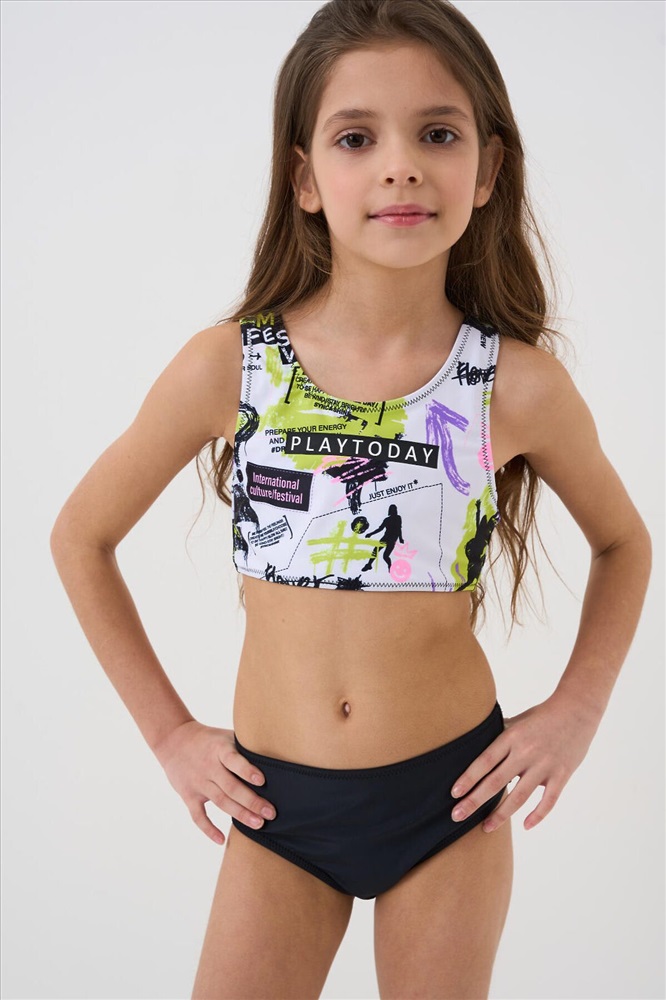 Комплект для девочки подростка: раздельный купальник и плавательные шорты. Верх выполнен в виде топа с широкими лямками. Топ плотно прилегает, имеет круглую горловину и глубокие проймы. На груди топа размещён логотип "PLAYTODAY". Плавки чёрного цвета с удобной посадкой. Внутри изделия мягкая подкладка. Шорты – свободные, с ярким принтом в стиле граффити и надписями. Пояс на резинке со шнурком обеспечивает комфортную посадку. Благодаря UF-защите, ткань сохраняет первоначальный вид даже при длительном пребывании на солнце. Подходит для плавания и активного отдыха.