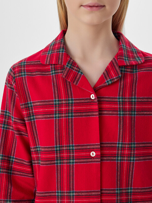 Рубашка прямого силуэта, с отложным воротником, спинка цельнокроеная. Рукав втачной, одношовный, длинный. Центральная застежка переда на пуговицах (4шт) d= 10 mm. Брюки свободные, прямые со средним швом и боковыми. Пояс цельнокроеный с эластичной тесьмой внутри (внутрення резина 30RV), ширина 30 мм. Низ рубашки и брюк обработан на 2-х игольной плоскошовной машине швом в подгибку. 100% хлопок Комментарии к товару