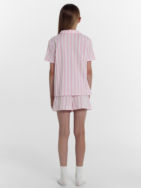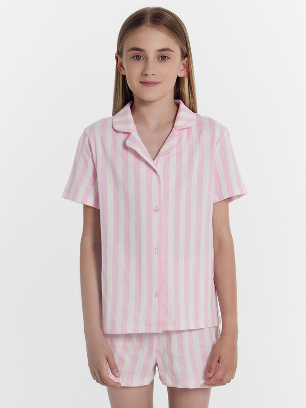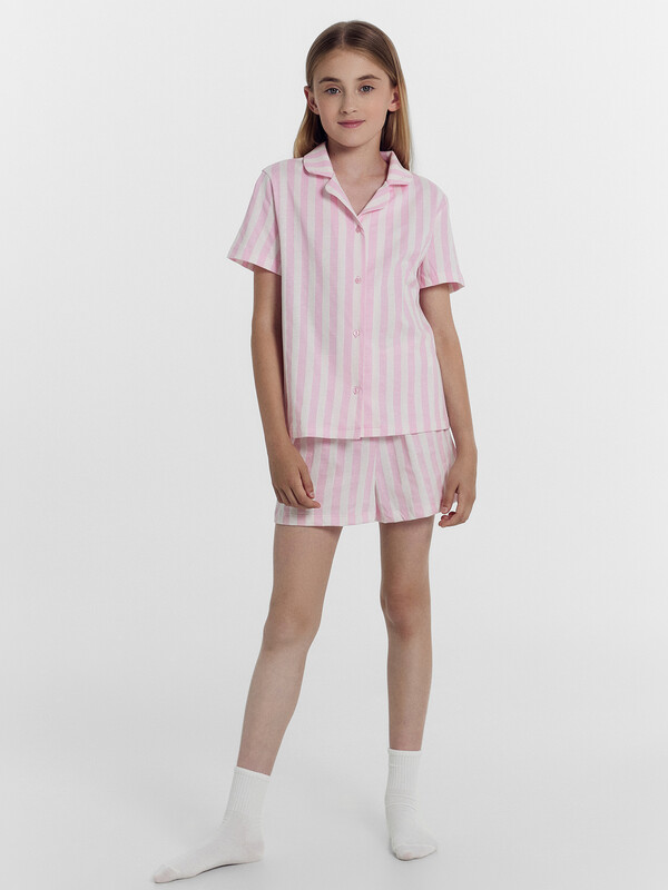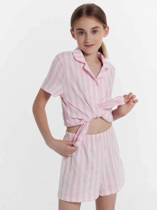 Комплект состоит из рубашки и шорт. Рубашка прямого силуэта, с отложным воротником, спинка цельнокроеная. Плечо слегка спущено. Рукав втачной, одношовный, короткий. Центральная застежка на пуговицы.