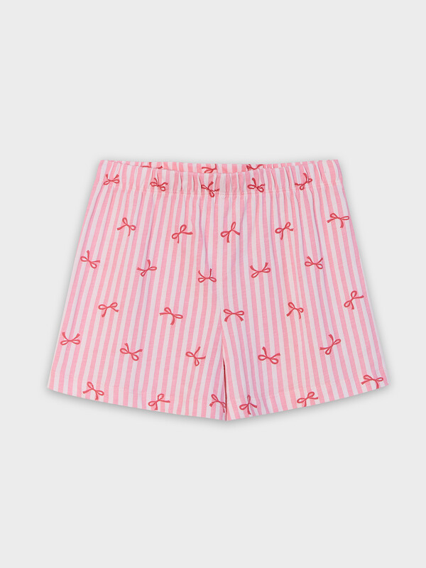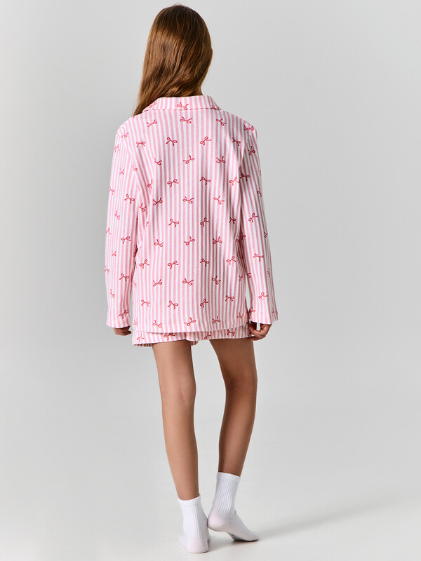 Рубашка прямого силуэта, с отложным воротником, спинка цельнокроеная. Плечо слегка спущено. Рукав втачной, одношовный, длинный. Центральная застежка переда на пуговицах (5 шт) d= 10 mm. Короткие шорты со средней посадкой талии. Пояс цельнокроеный с эластичной тесьмой внутри (внутрення резина 30RV), ширина 30 мм. Низ рубашки и шортов обработаны на 2-х игольной плоскошовной машине швом в подгибку. 100% хлопок Комментарии к товару