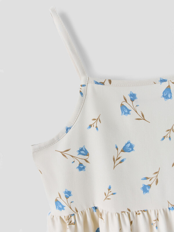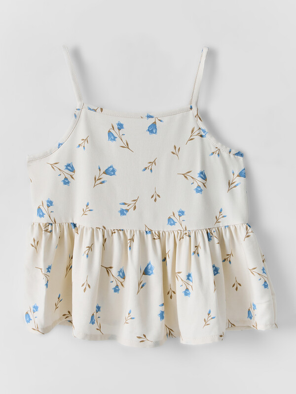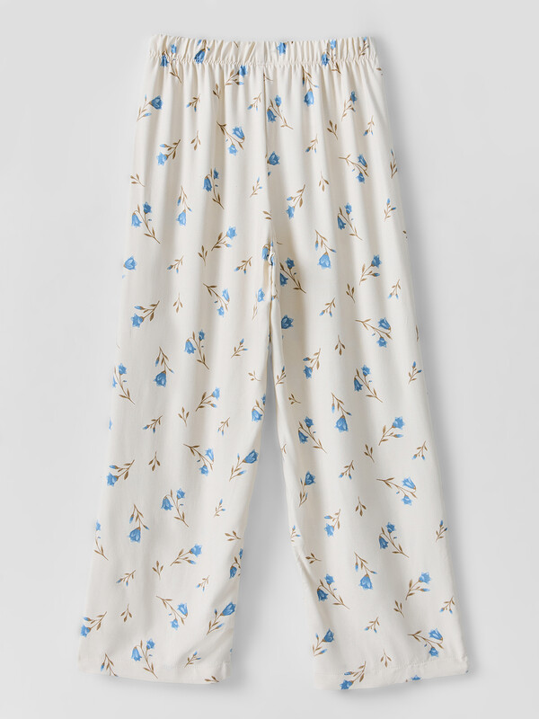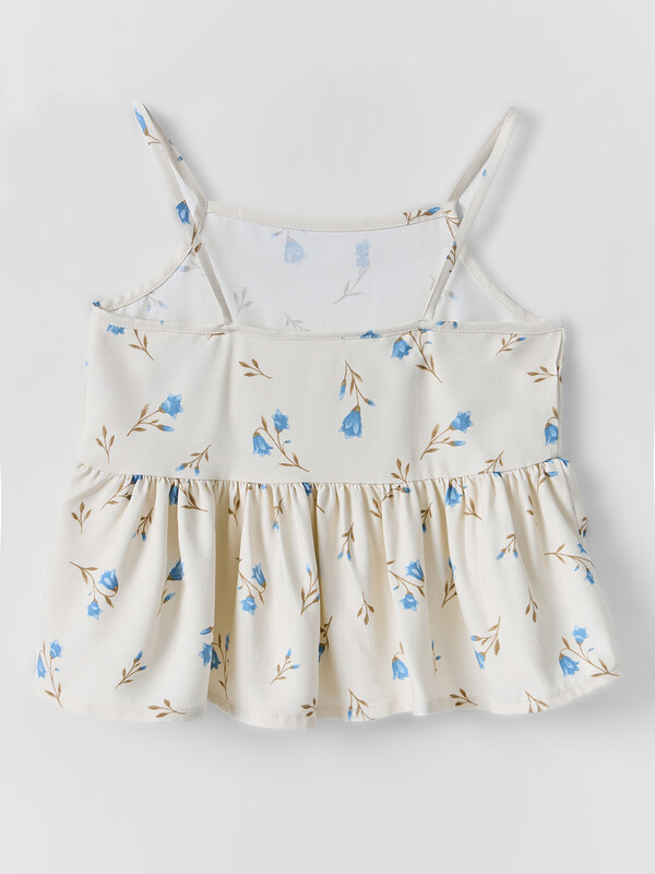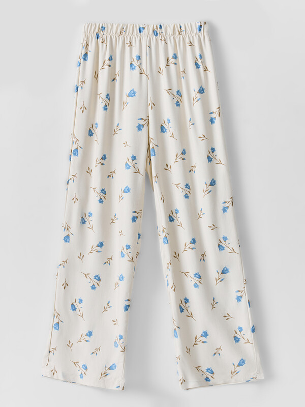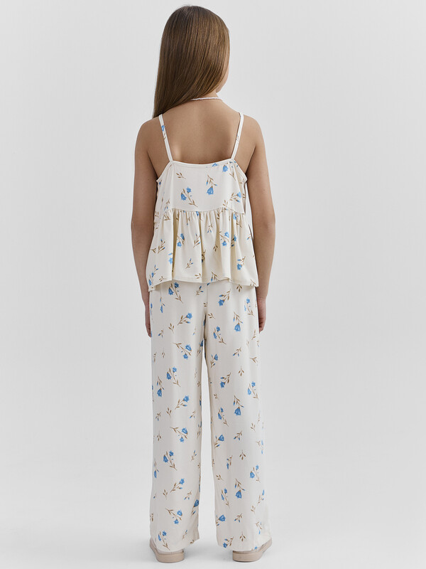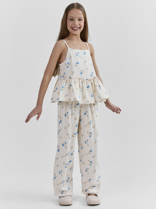 Комплект состоит из топа и брюк. Топ с узкими бретелями и с воланом на сборке по низу. Брюки прямые с цельнокроенным поясом. Внутрь пояса застрочена эластичная тесьма. Низ изделия обработан швом в подгибку с закрытым срезом.