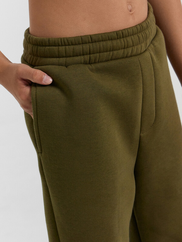 Брюки свободного силуэта с карманами в боковых швах. Пояс отрезной с внутренней эластичной тесьмой. По поясу выполнены 3 декоративные строчки, с внутренней стороны пробиты петли и протянут шнур. Боковые швы смещены вперед. По переду изделия имитация гульфика. По низу брюк манжеты из трикотажного полотна рибаны.