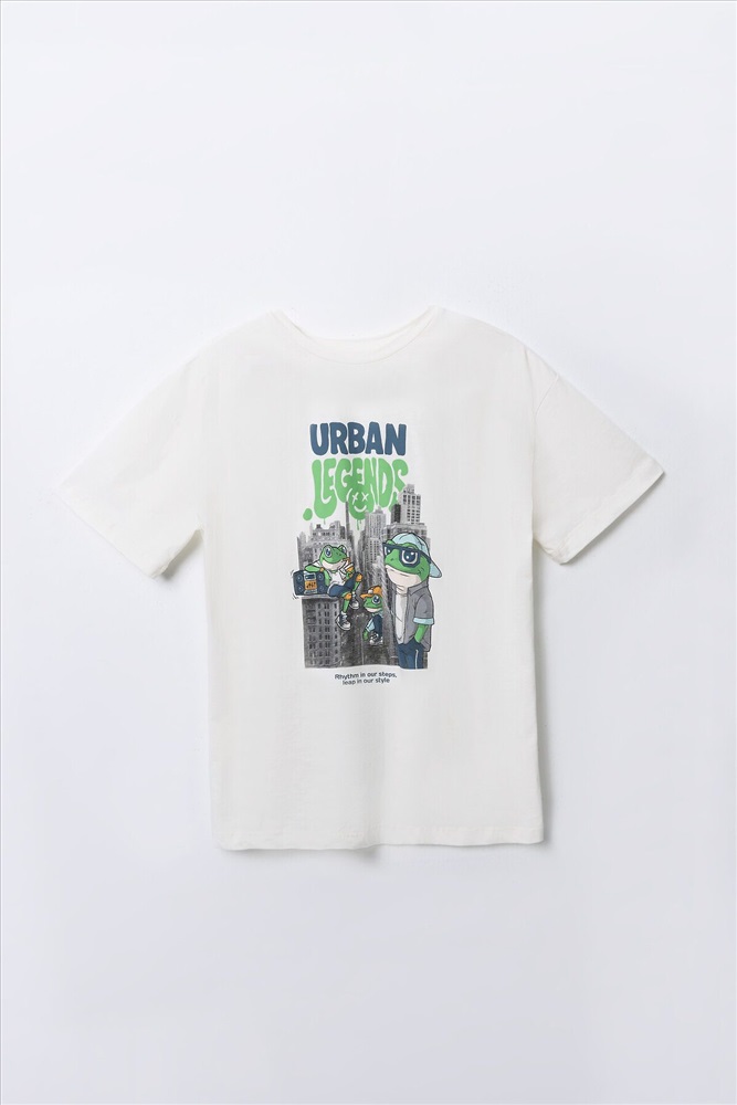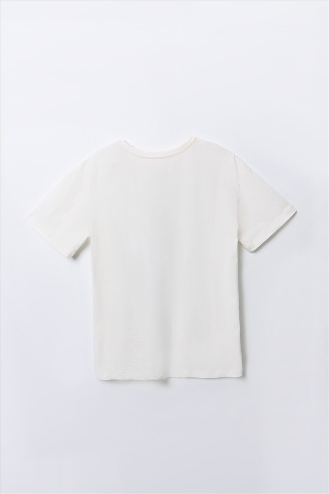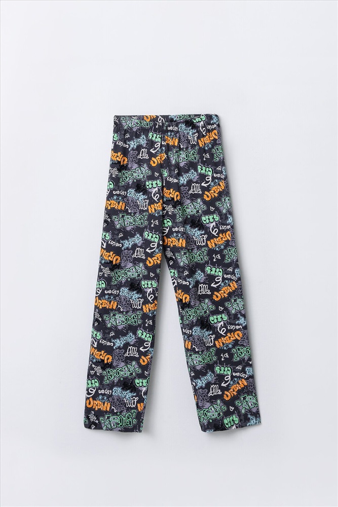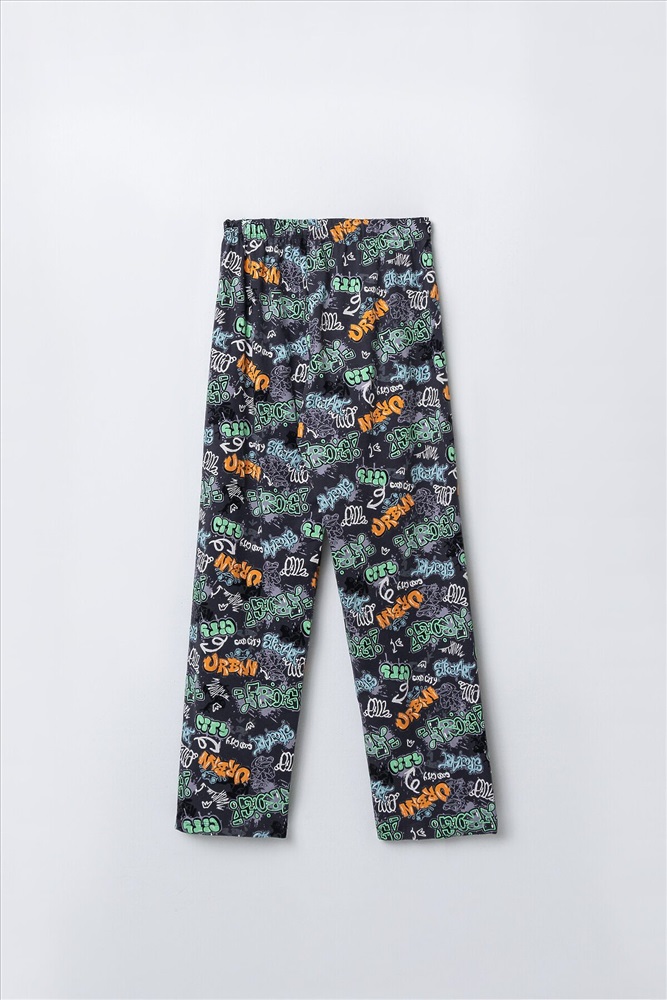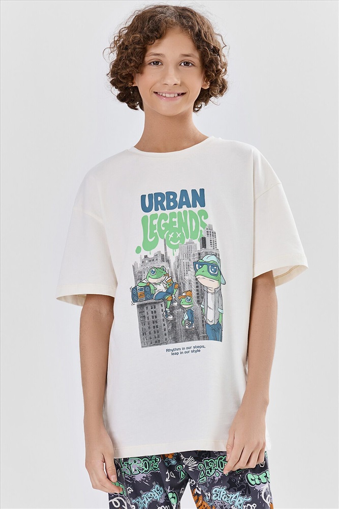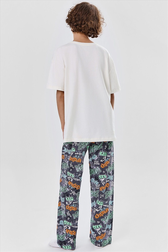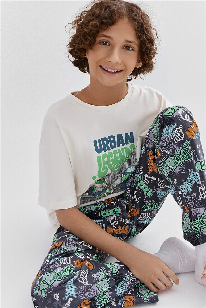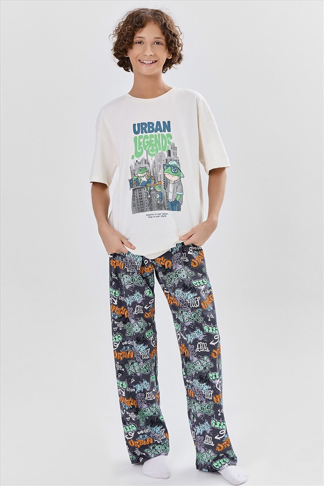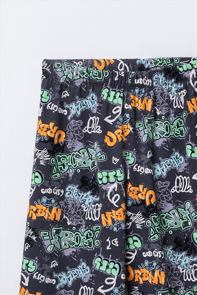Комплект для мальчиков состоит из джемпера и брюк. Джемпер прямого, свободного силуэта. Перед и спинка цельнокроеные. Плечо слегка спущено. Горловина круглой формы с притачной обтачкой из основного полотна. Рукав втачной, одношовный, короткий. Брюки прямого, свободного силуэта. Пояс цельнокроеный с эластичной тесьмой внутри(внутрення резина 30RV), ширина 30 мм. Низ джемпера и брюк обработан на 2-х игольной плоскошовной машине швом в подгибку
