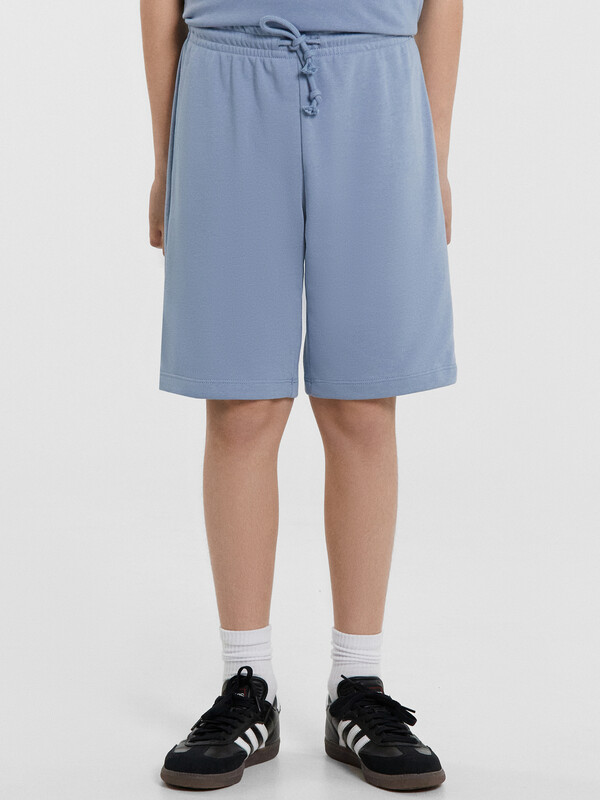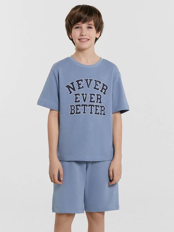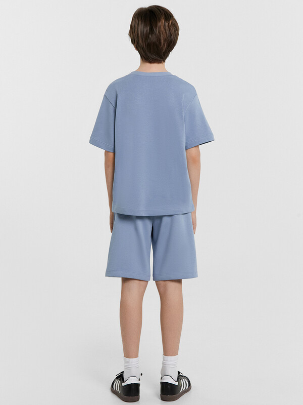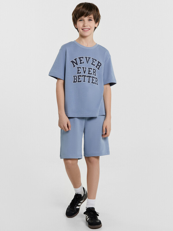 Стильный комплект для мальчиков. Изготовлен из трикотажного футера. Футболка свободного силуэта, длиной до середины бедер, с короткими рукавами и круглой горловиной. Шорты длиной до колена, с эластичной резиной в поясе и регулировочным шнурком. Отличный выбор!