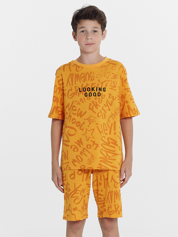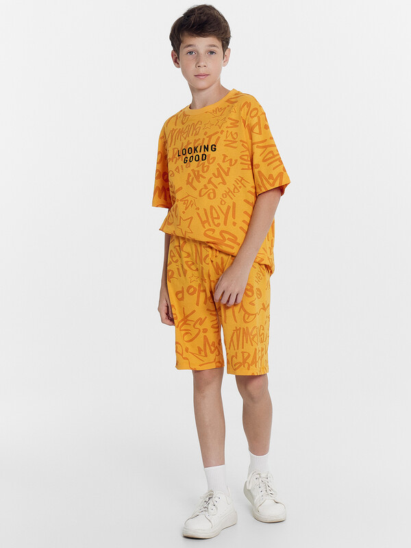 Стильный комплект для мальчиков. Изготовлен из трикотажного футера. Футболка свободного силуэта, длиной до середины бедер, с короткими рукавами и круглой горловиной. Шорты длиной до колена, с эластичной резиной в поясе и регулировочным шнурком. Отличный выбор!