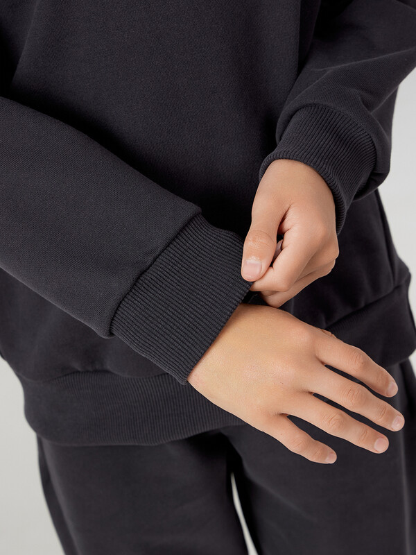 Комплект для мальчиков из худи и брюк — это удобный, стильный и функциональный вариант на каждый день. Свободный силуэт худи с капюшоном обеспечивает максимальный комфорт и не ограничивает движения, а капюшон со средним швом сохраняет форму и защищает в прохладную погоду. Спущенная линия плеча и длинные рукава создают расслабленный современный образ, а манжеты и пояс из рибаны добавляют структуру, аккуратную посадку и устойчивость к растягиванию.Брюки без бокового шва — это дополнительный комфорт, особенно при активной носке. Эластичный пояс с утягивающим шнуром позволяет регулировать объем, обеспечивая удобную фиксацию. Манжеты из рибаны по низу брюк гармонируют с отделкой худи, создавая цельный и сбалансированный образ. Модель выполнена из футера без подчеса — плотного, прочного и воздухопроницаемого материала, который хорошо держит форму и остается комфортным при носке. Комплект прекрасно подходит как для дома, так и для прогулок, игр или занятий — универсальное решение для активного ребёнка.