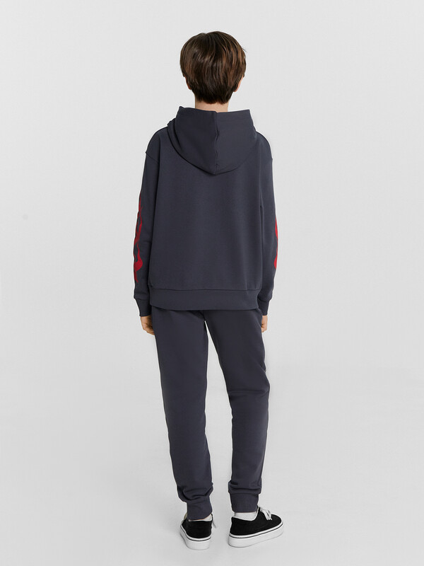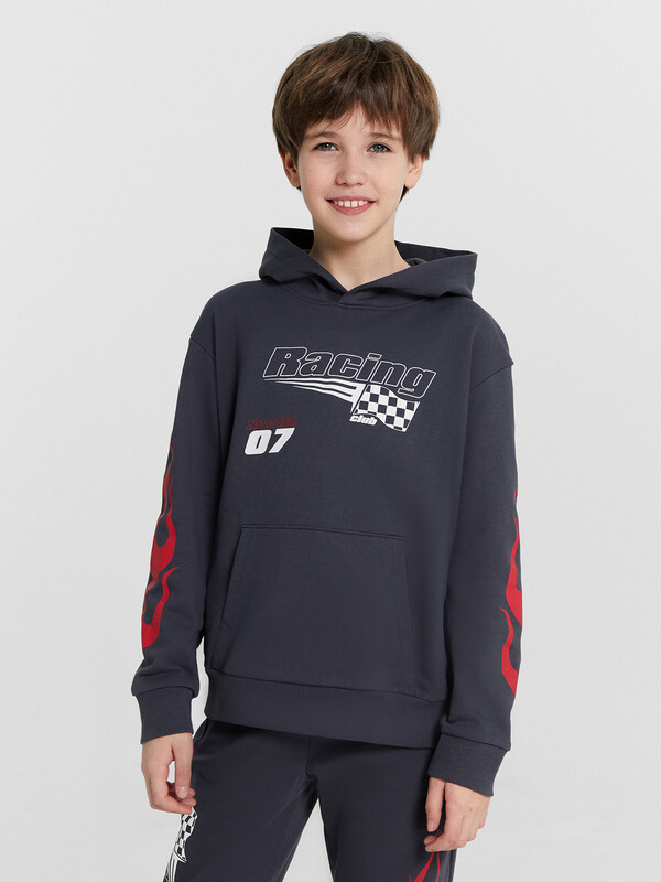Анорак для мальчиков свободного силуэта с капюшоном. Капюшон на подкладке из трикотажного кулирного полотна. Шов втачивания капюшона закрыт хб тесьмой. Рукава втачные, линия плеча спущена. Притачные манжеты по низу рукавов и притачной пояс из трикотажного полотна рибаны 2*2. По переду карман кенгуру.