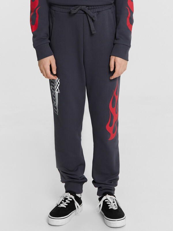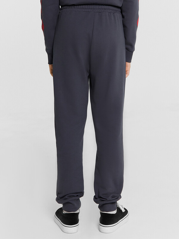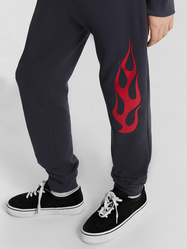 Брюки прямого силуэта. Пояс отрезной, с эластичной тесьмой внутри. По поясу проложены 2 отделочные строчки. По переду оформлены рельефы с карманами. В поясе пробиты петли, протянут шнур 10мм. Низ брюк обработан манжетами из трикотажного полотна рибаны 2*2.