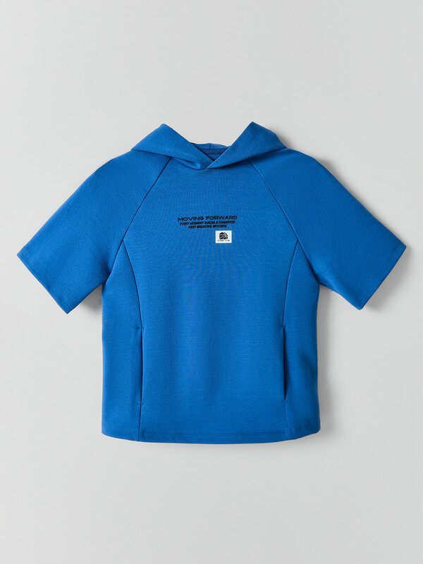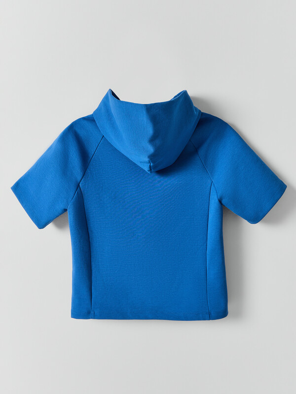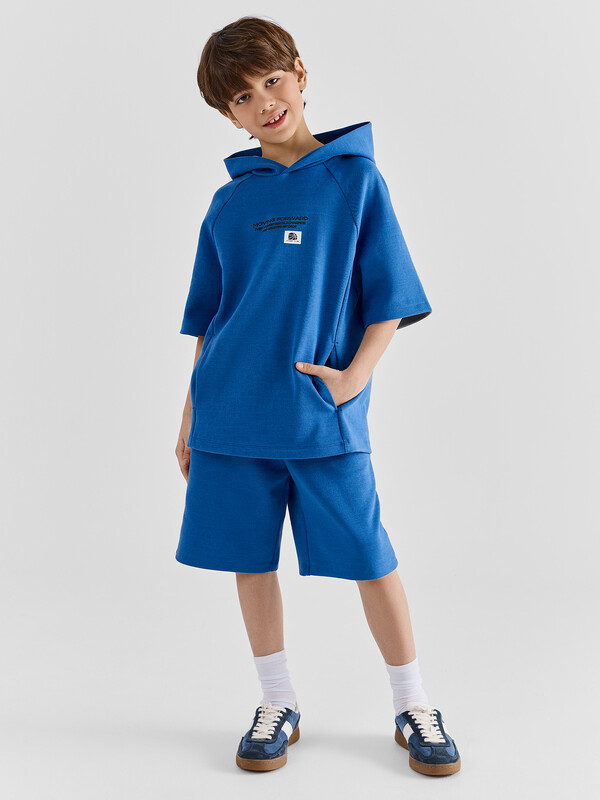 Худи оверсайз с капюшоном.. Рукава короткий, реглан. Горловина круглой формы. Шов притачивания закрыт х/б тесьмой . Боковые швы перенесены вперед. В боковых швах - карманы. Низ изделия и рукавов в подгибку. Шорты выше колена, свободного силуэта с средней посадкой. С карманами в боковых швах. Пояс отрезной внутри с резиной 40RV, с внутренней стороны пробиты петли и протянут шнур 10PXС-1. Низ шорт в подгибку 85% хлопок; 15% полиэстер Комментарии к товару