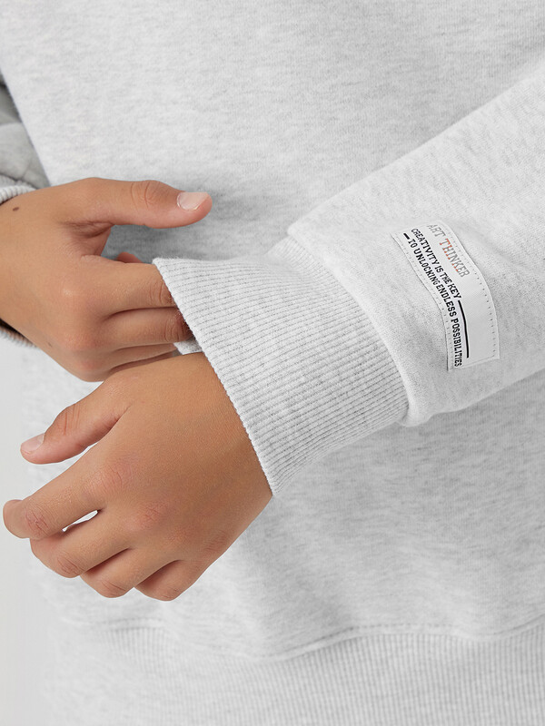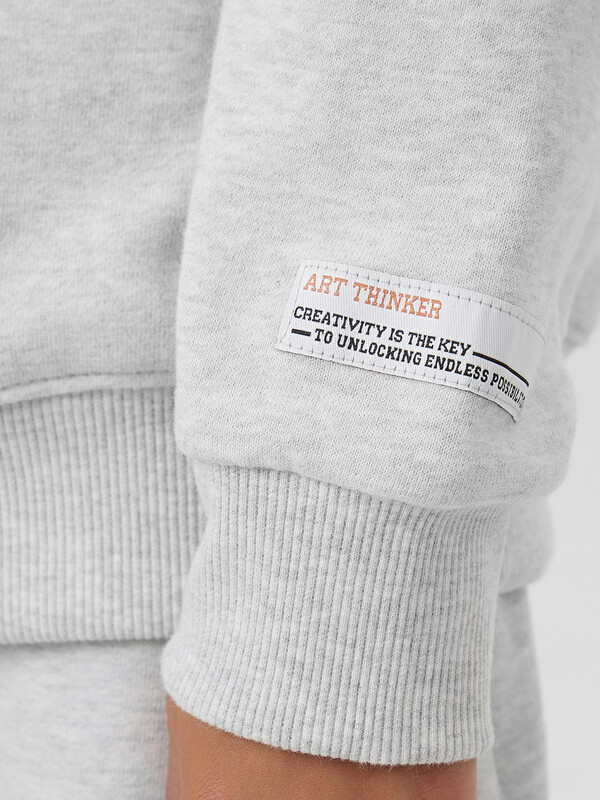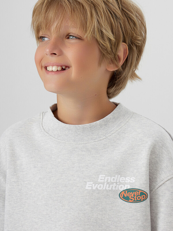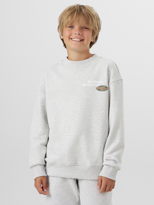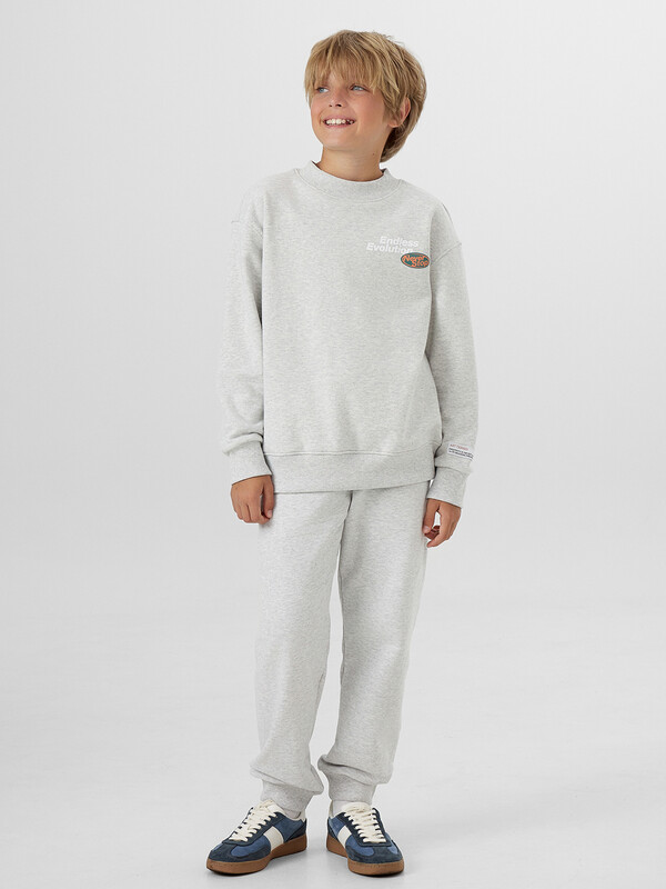 Свитшот прямого силуэта для мальчиков. Горловина округлой формы. Плечо слегка спущено, рукав втачной длинный. По низу рукава отрезная манжета из рибаны. Пояс отрезной из рибаны, отстрочен. Брюки для мальчиков. Без бокового шва. Карманы в вытачке. Пояс отрезной с внутренней эластичной тесьмой 50RV. Пояс прострочен двумя отделочными строчками. Внутри в пояс втянут шнур. Низ брюк обработан манжетами из рибаны.