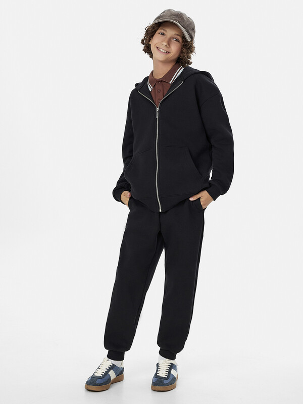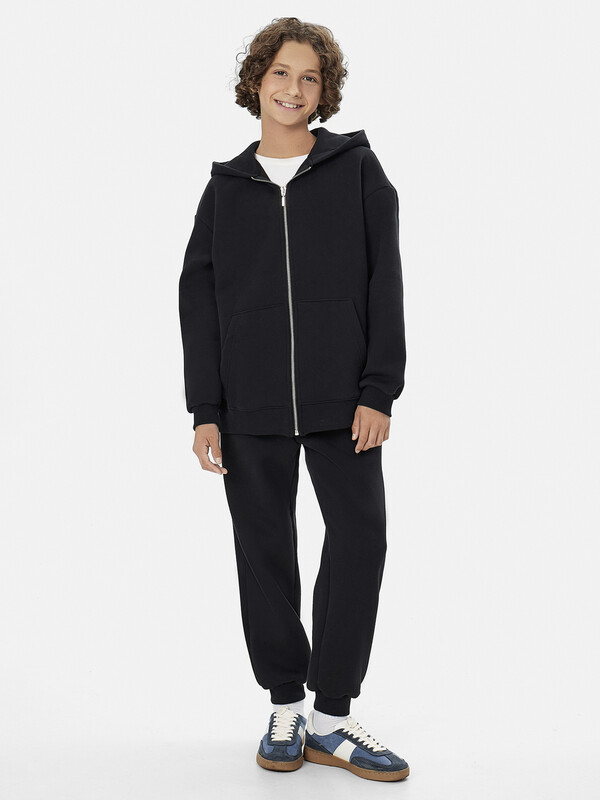 Горловина округлой формы. Капюшон на подкладке из основного полотна. Шов притачивания закрыт х/б тесьмой Рукава втачные длинные, плечо спущено. По низу рукава отрезная манжета из рибаны. Центральная застежка на тесьму молнию. По переду накладные карманы кенгуру.Пояс отрезной из рибаны. Брюки джоггеры свободные. Пояс отризной с эластичной тесьмой внутри 50RV. С внешней стороны пояса пробиты петли и втянут шнур 8PXC-2. Карманы в боковых швах. По низу отрезные манжеты из рибаны. 65% хлопок; 35% полиэстер Комментарии к товару