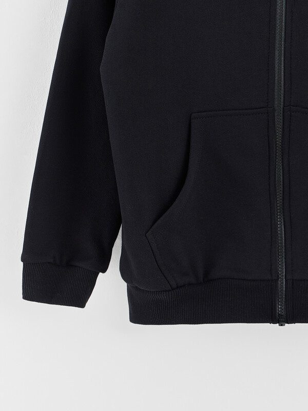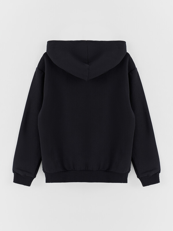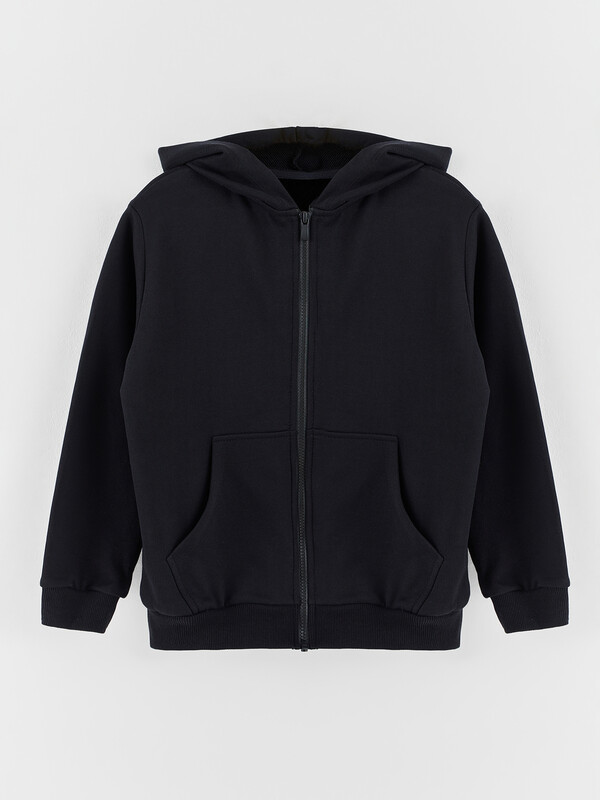 Комфортный комплект из трикотажного футера с теплым подчесом. Включает худи на молнии свободного силуэта с капюшоном и брюки прямого силуэта с эластичной тесьмой и регулировочным шнурком в поясе. Линия плеча жакета немного спущена, что дарит свободу движений. Практичности добавляет карман-кенругу. Рекомендуем вашему мальчику!