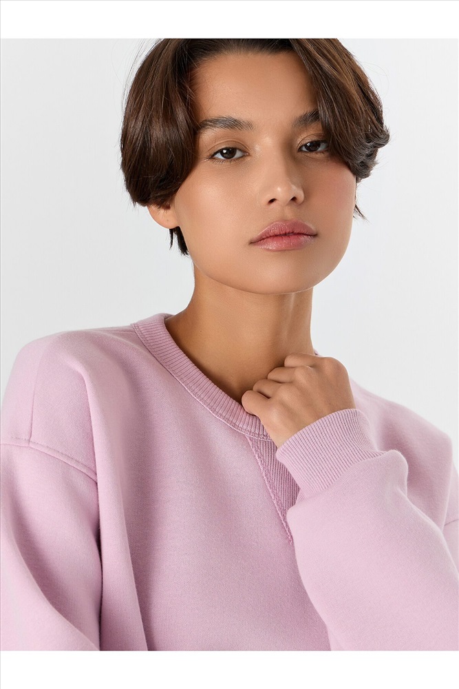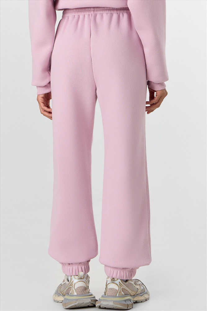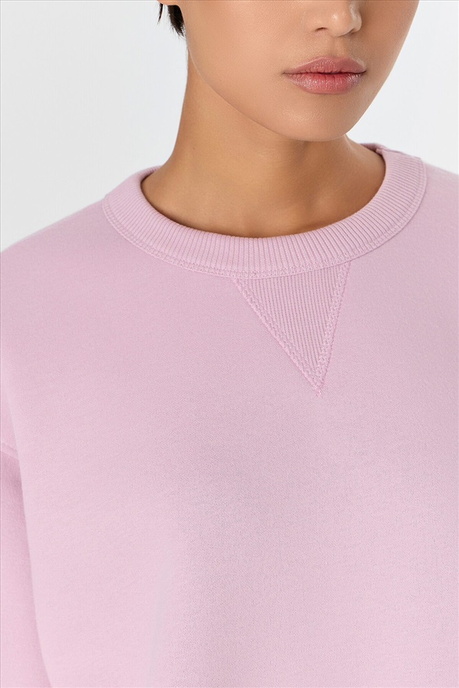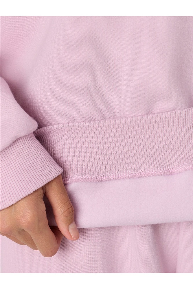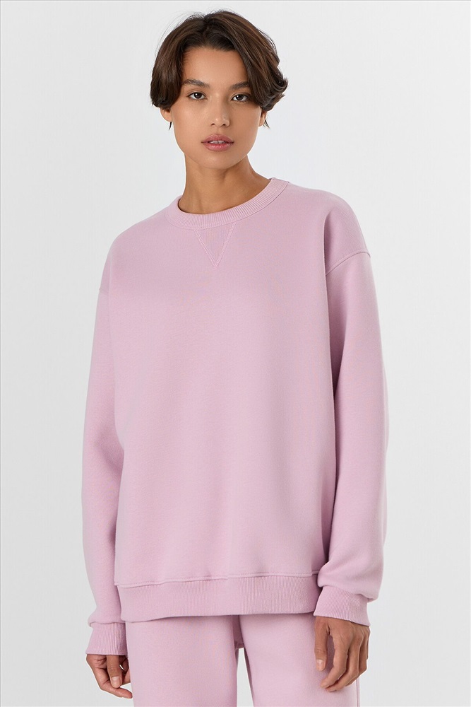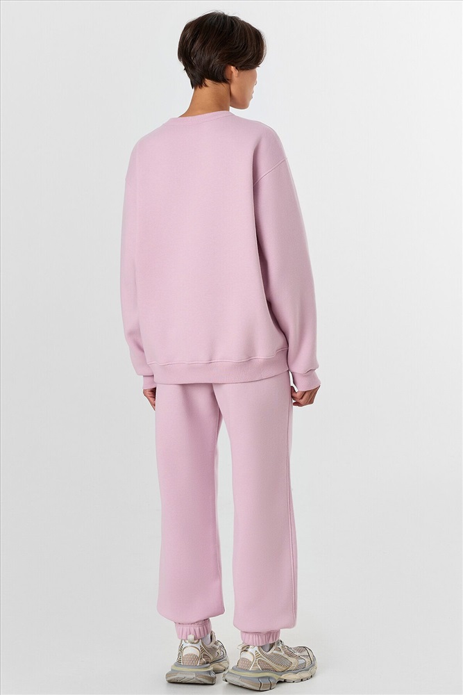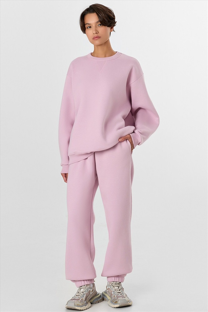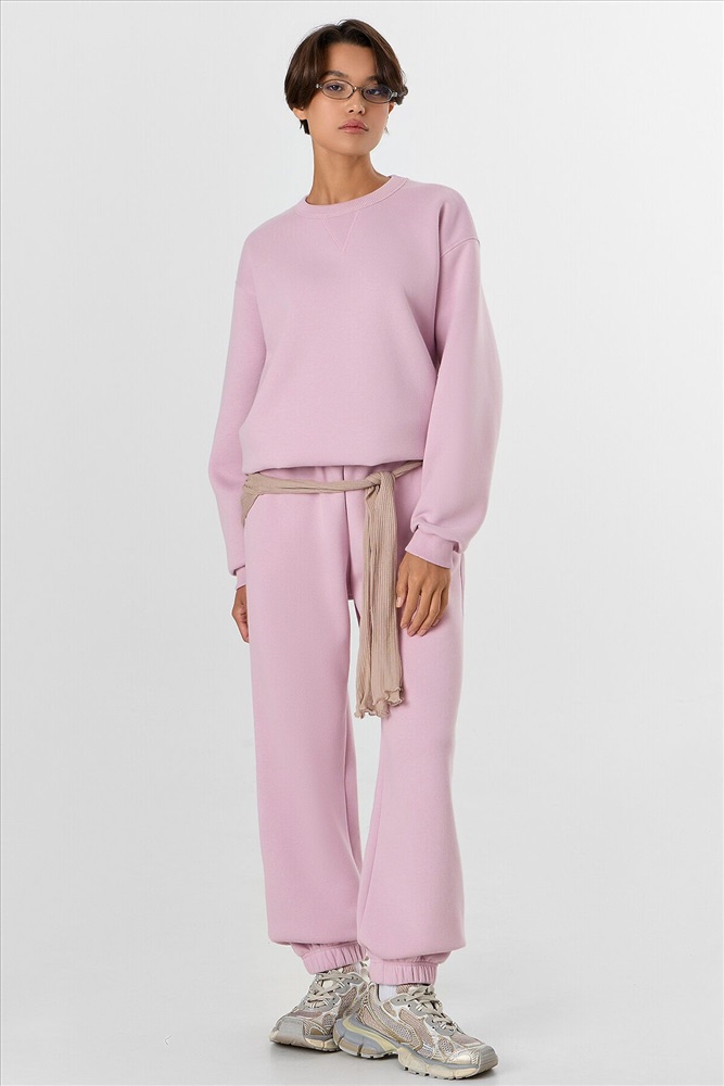 Джемпер свободного силуэта. Перед и спинка цельнокроеные. Горловина круглой формы обработана обтачкой из рибаны. Под горловиной декоративный треугольник из рибаны настроченный на плоскошовной машине. Рукав втачной, длинный с манжетами из рибаны. По низу изделия пояс из рибаны. Джогеры свободного силуэта. Пояс цельнокроеный, с втачной эластичной тесьмой 50RV, по центру пробиты петли и вставлен шнур круглый 8м с узлами на концах (8КXWС-1). В боковых швах карманы. Низ изделия обработан швом в подгибку с втачной эластичной тесьмой 40RV.