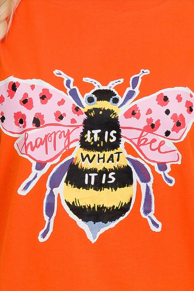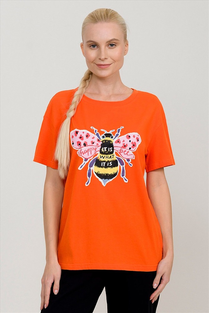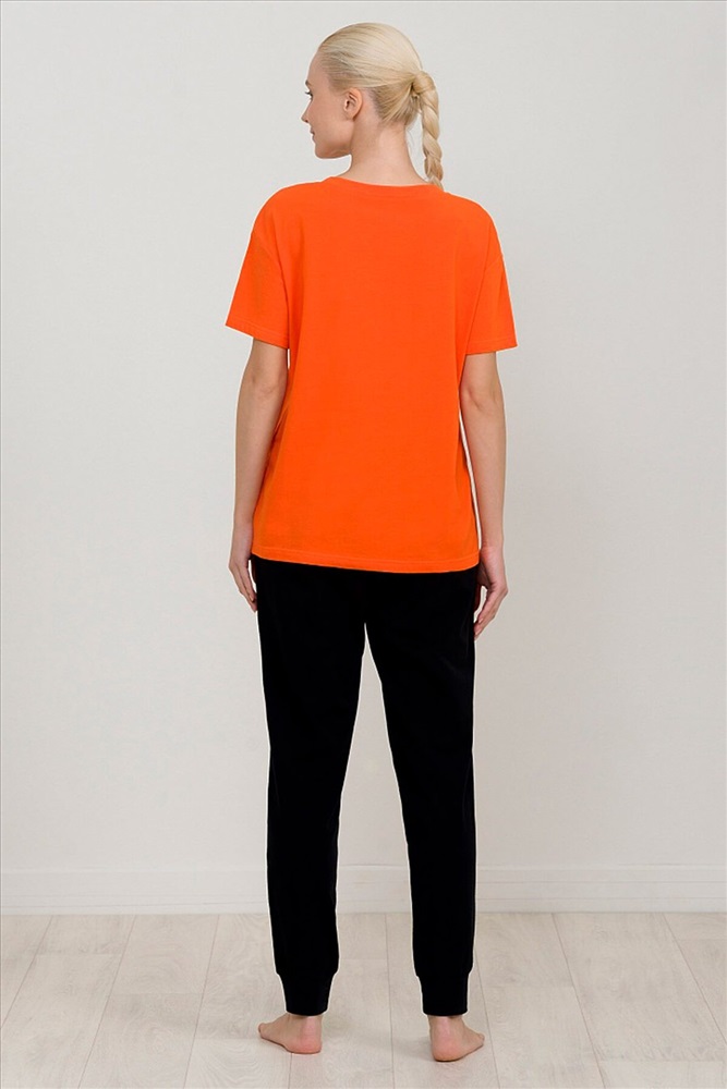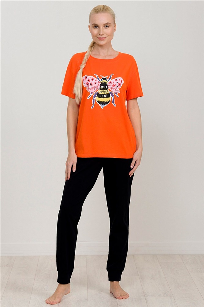ID товара: 749478 Состав: 95% Хлопок, 5% Эластан Сезон: Весна/Лето Длина: Средняя Фасон: Повседневный Рукав: Короткие Вырез горловины: Округлый Рисунок: Надпись Декоративные элементы: Печатный принт Основная ткань: Хлопок Стиль: Повседневный Страна бренда: Россия Страна производства: Китай Комплект женский футболка и брюки. Футболка прямого кроя среднего объема с эластичным rubber принтом. Перевод Счастливая пчелка ничего не поделаешь. Брюки умеренного объема на комфортной внутренней резинке с широкими манжетами из основной ткани. Комментарии к товару