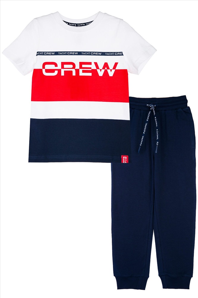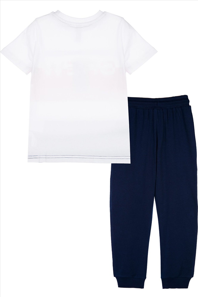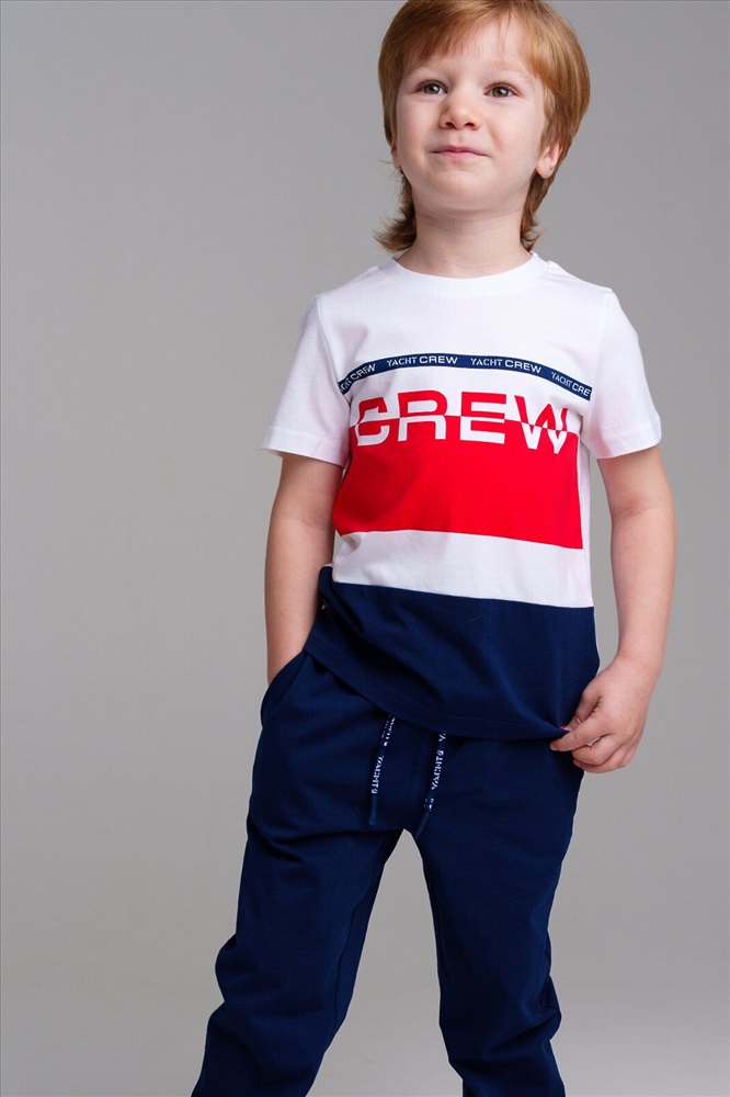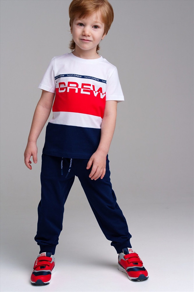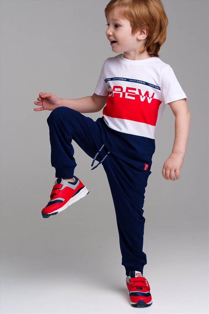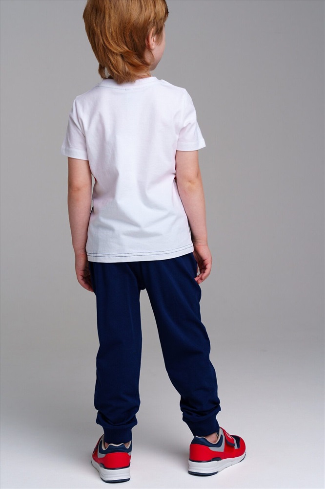 Комплект: футболка, брюки из качественного и приятного на ощупь трикотажа джерси. Высокое содержание хлопка 95%. Благодаря наличию эластана в составе ткани изделие проще в уходе и держит форму. Regular fit. Эластичный пояс со шнурком. Карманы. Манжеты брюк в эластичный рубчик.