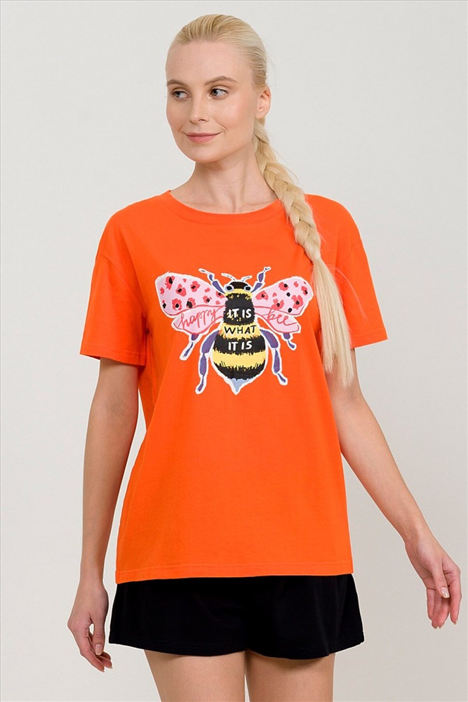 ID товара: 749851 Состав: 95% Хлопок, 5% Эластан Сезон: Весна/Лето Длина: Средняя Фасон: Свободный крой Рукав: Короткие Вырез горловины: Округлый Рисунок: Фантазийный Декоративные элементы: Печатный принт Основная ткань: Хлопок Стиль: Повседневный Страна бренда: Россия Страна производства: Китай Комплект женский футболка и шорты. Футболка прямого кроя среднего объема с эластичным rubber принтом. Перевод Счастливая пчелка ничего не поделаешь. Шорты среднего объема, по талии на широкой резинке. Комментарии к товару