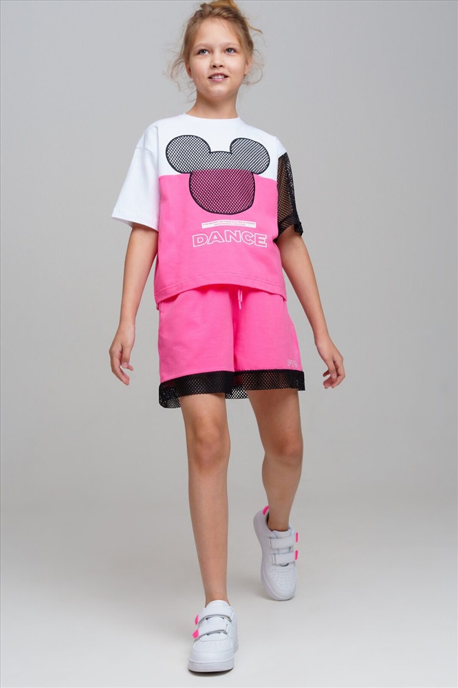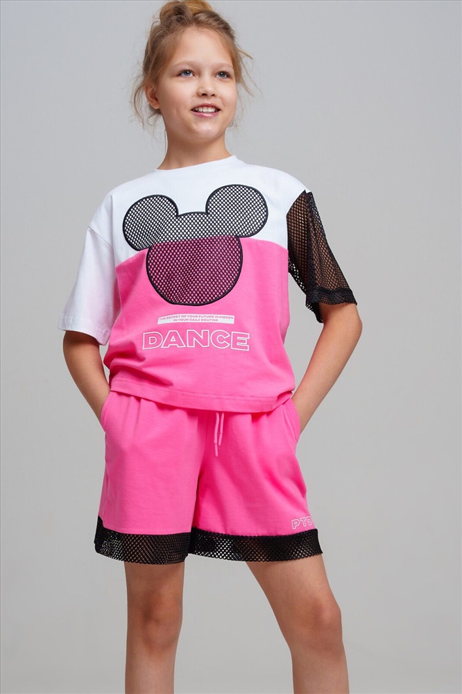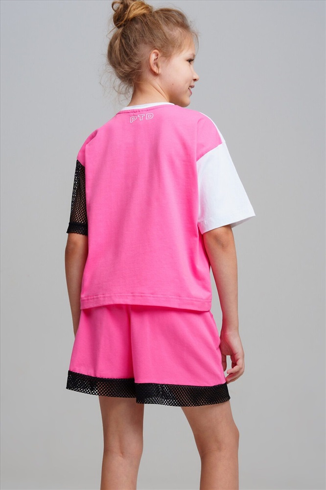 Костюм для девочки подростка. Футболка оверсайз, шорты из эластичного и приятного на ощупь трикотажа джерси. Шорты на резинке со шнурком. Высокое содержание хлопка. Декор из сетки. Модель выполнена из качественного и приятного на ощупь трикотажа.