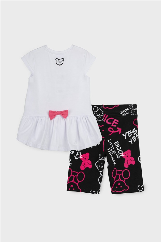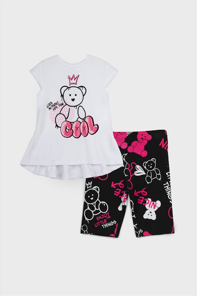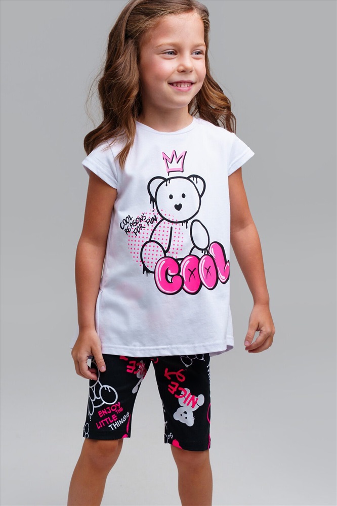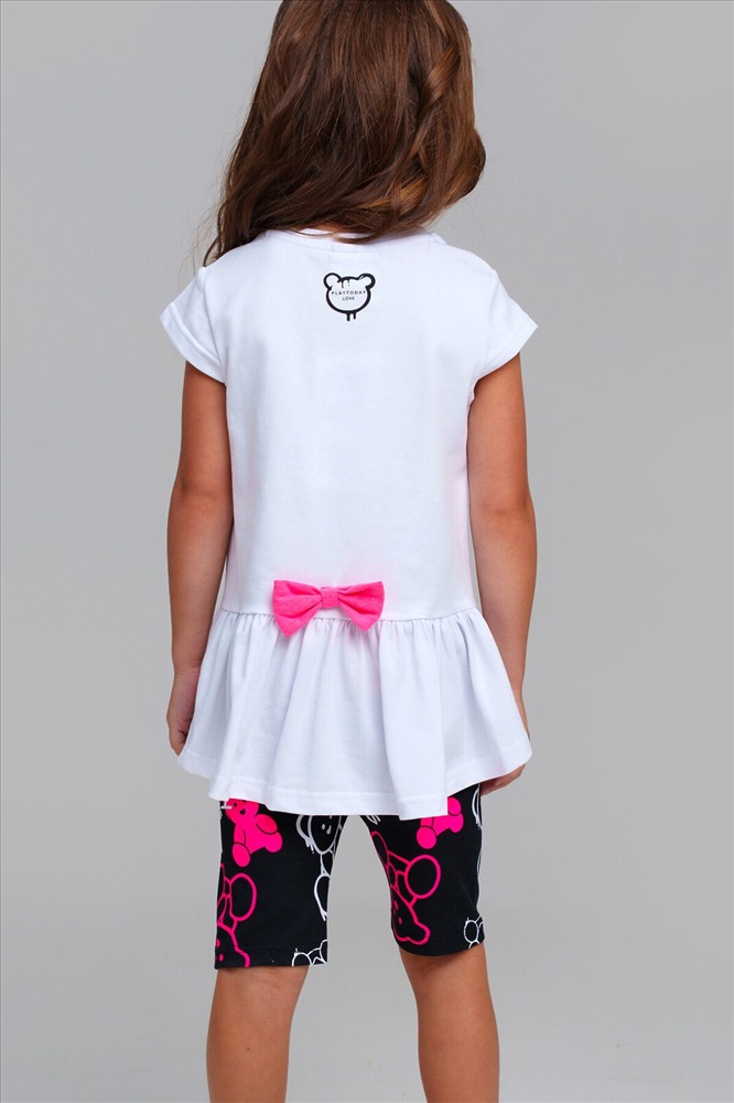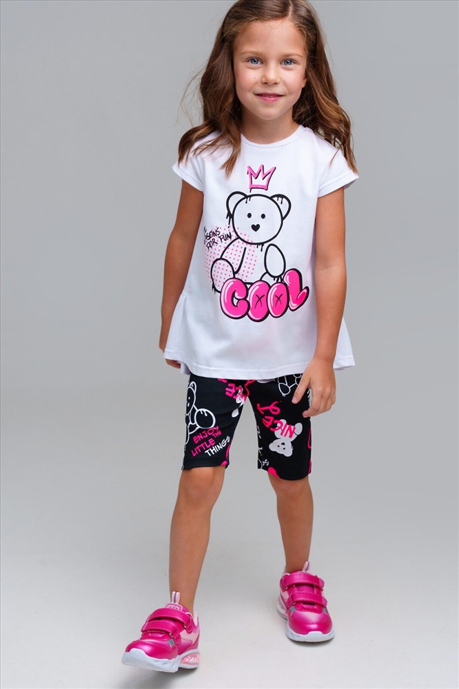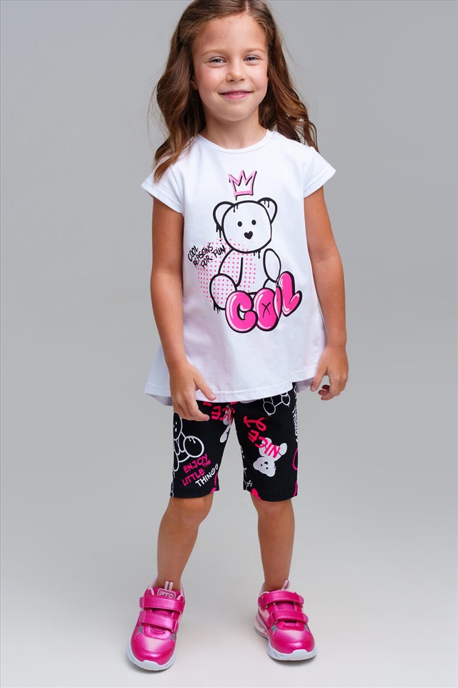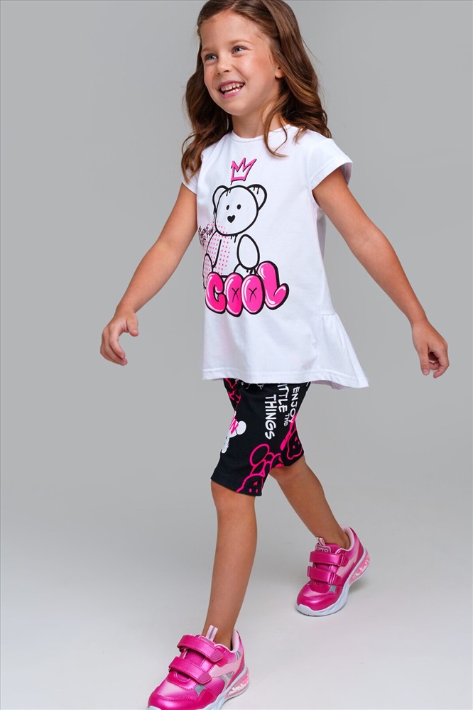 Костюм детский для девочки. Футболка, укороченные леггинсы из эластичного и приятного на ощупь трикотажа джерси. Леггинсы на резинке. Высокое содержание хлопка 95%. Благодаря наличию эластана в составе ткани изделие держит форму и меньше мнется. Модель выполнена из качественного и приятного на ощупь трикотажа.