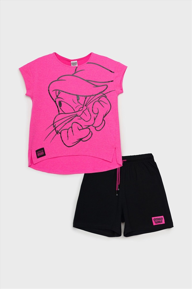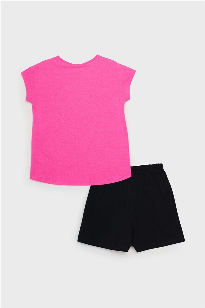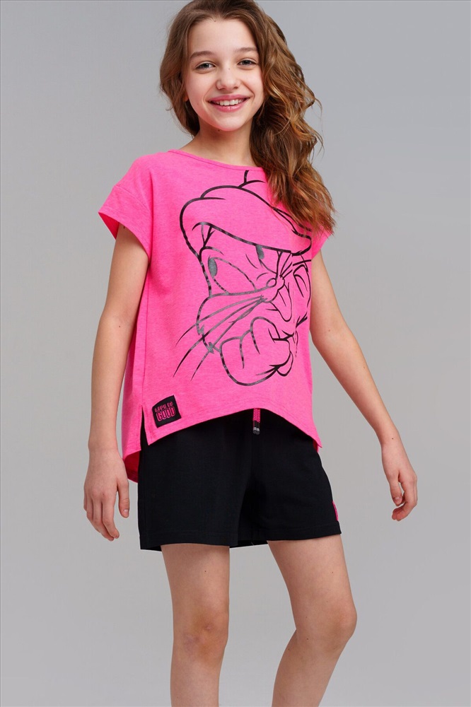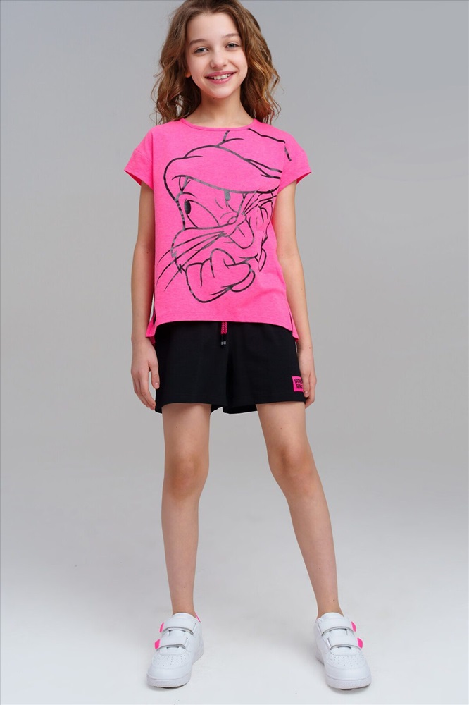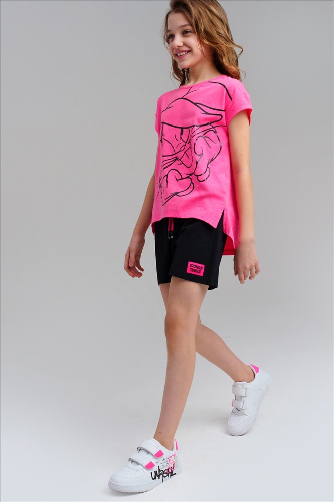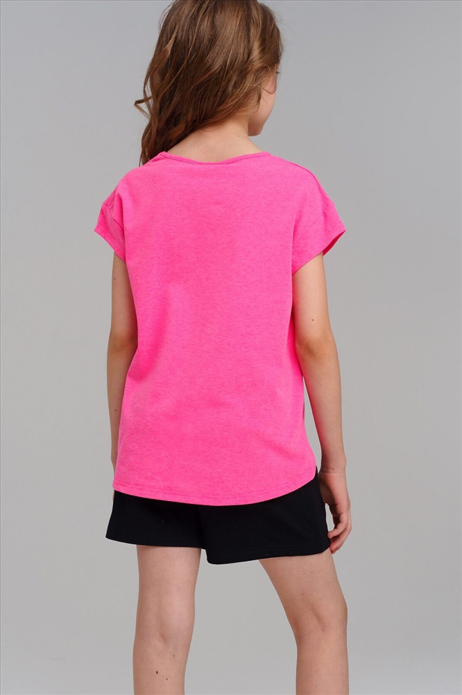 Костюм для девочки подростка. Комплект: футболка и шорты. Высокое содержание хлопка. Шорты на резинке со шнурком. Модель выполнена из качественного и приятного на ощупь трикотажа.
