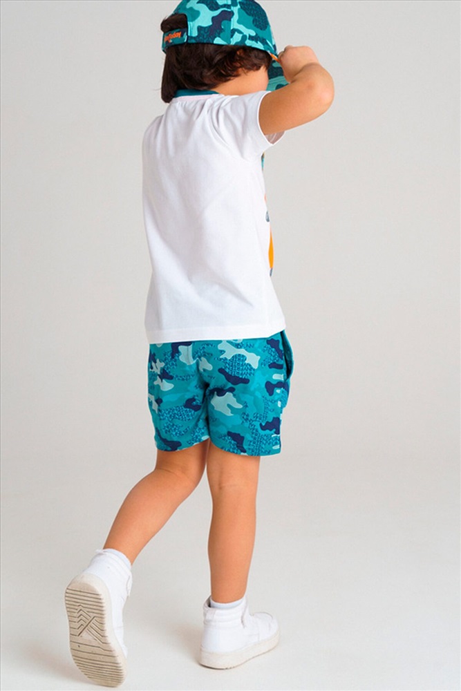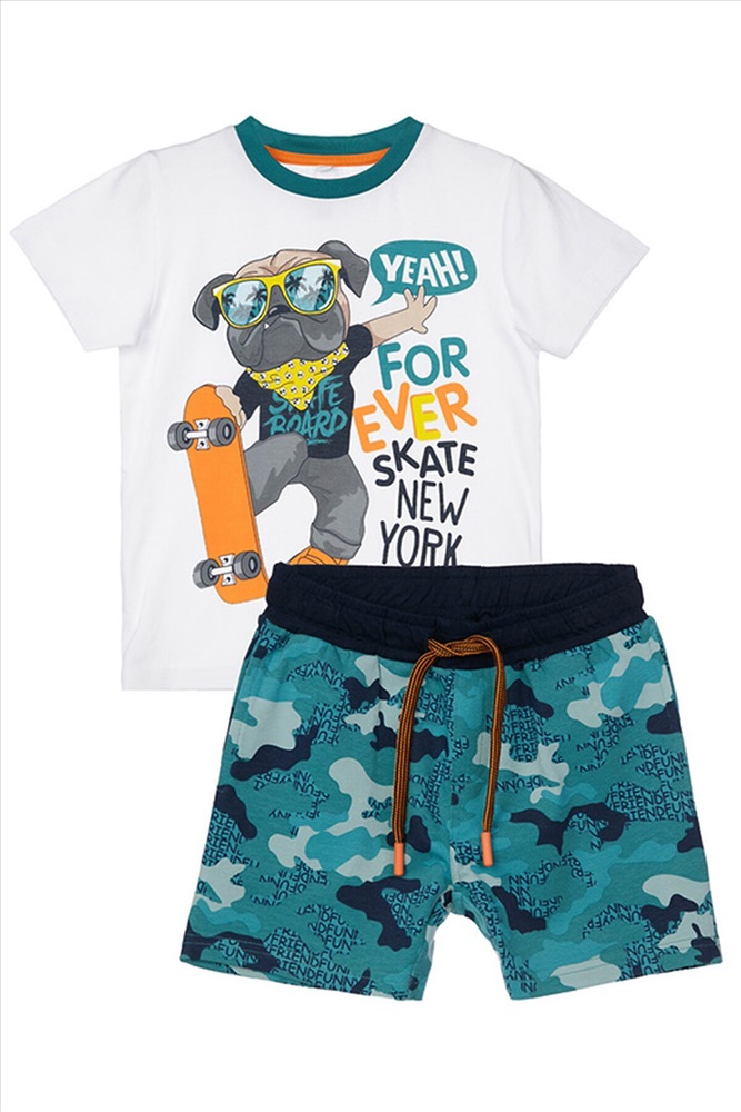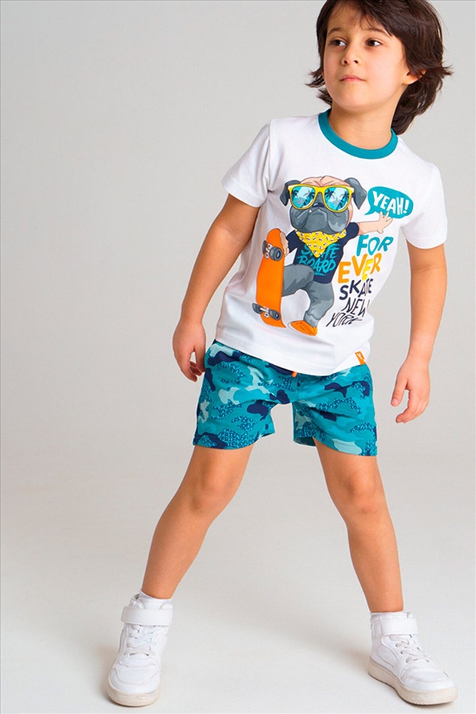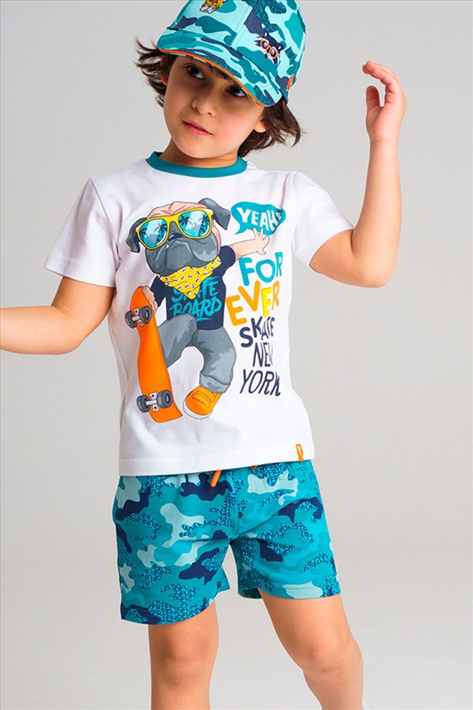 Комплект: футболка, шорты • из качественного эластичного и приятного на ощупь трикотажа джерси • высокое содержание хлопка 95% • благодаря наличию эластана в составе ткани изделие держит форму и меньше мнется • эластичный пояс с тесьмой позволяет легко надевать и утягивать до идеальной посадки в зависимости от комплекции ребенка • принт сохраняет первоначальный вид даже после многочисленных стирок