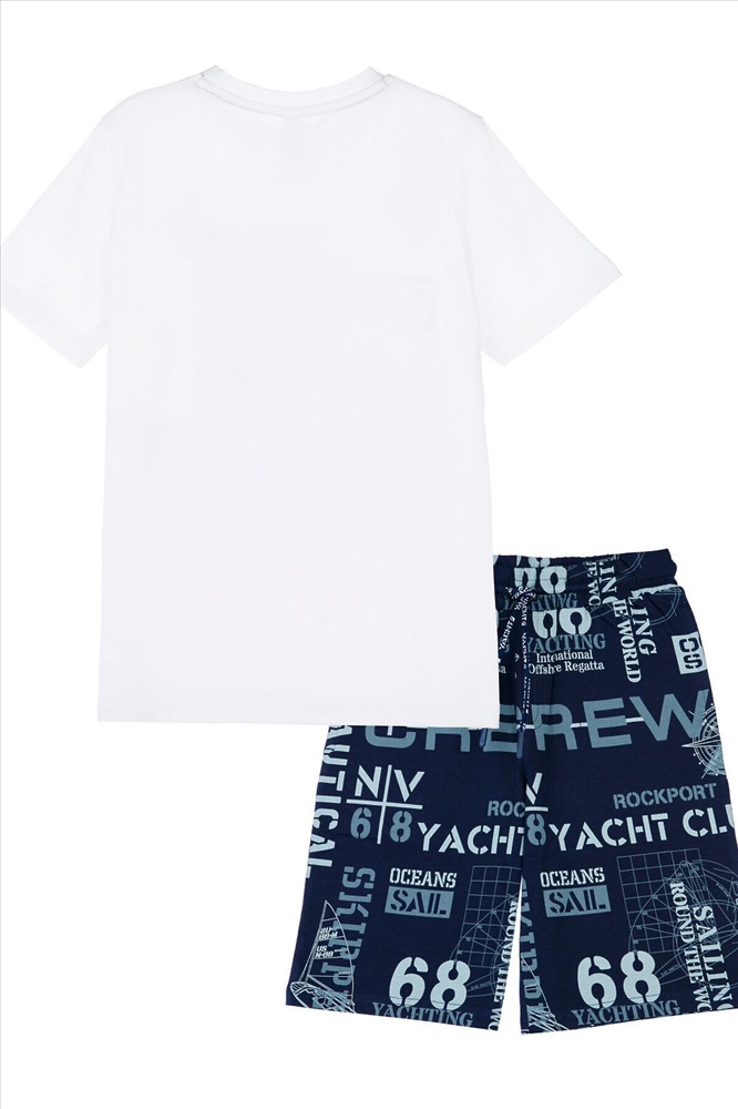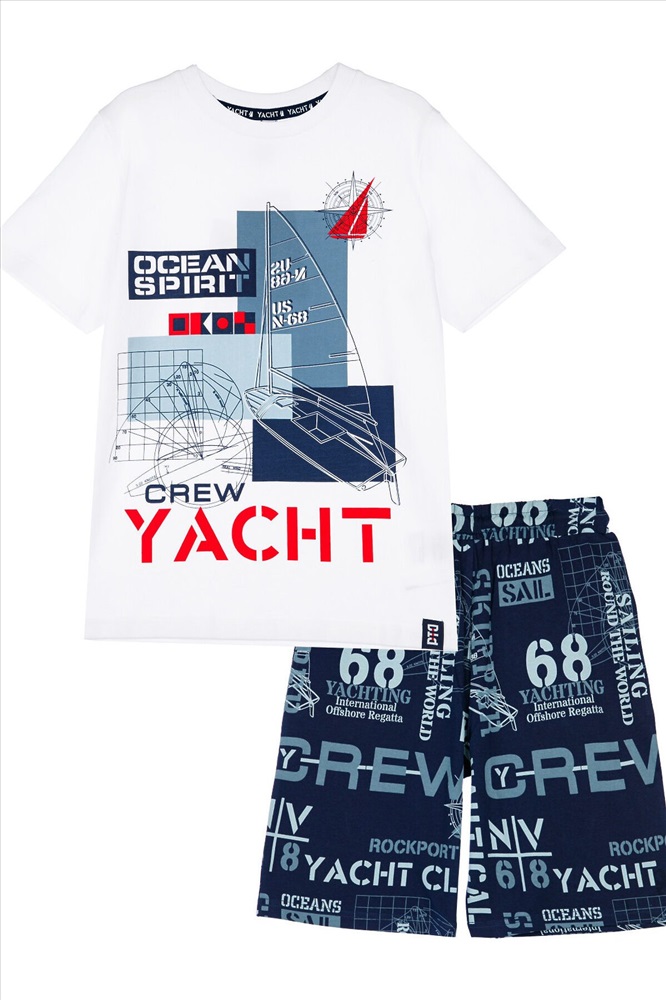 Комплект: футболка, шорты из качественного и приятного на ощупь трикотажа джерси. Высокое содержание хлопка 95%. Благодаря наличию эластана в составе ткани изделие проще в уходе и держит форму. Regular fit. Эластичный пояс со шнурком.