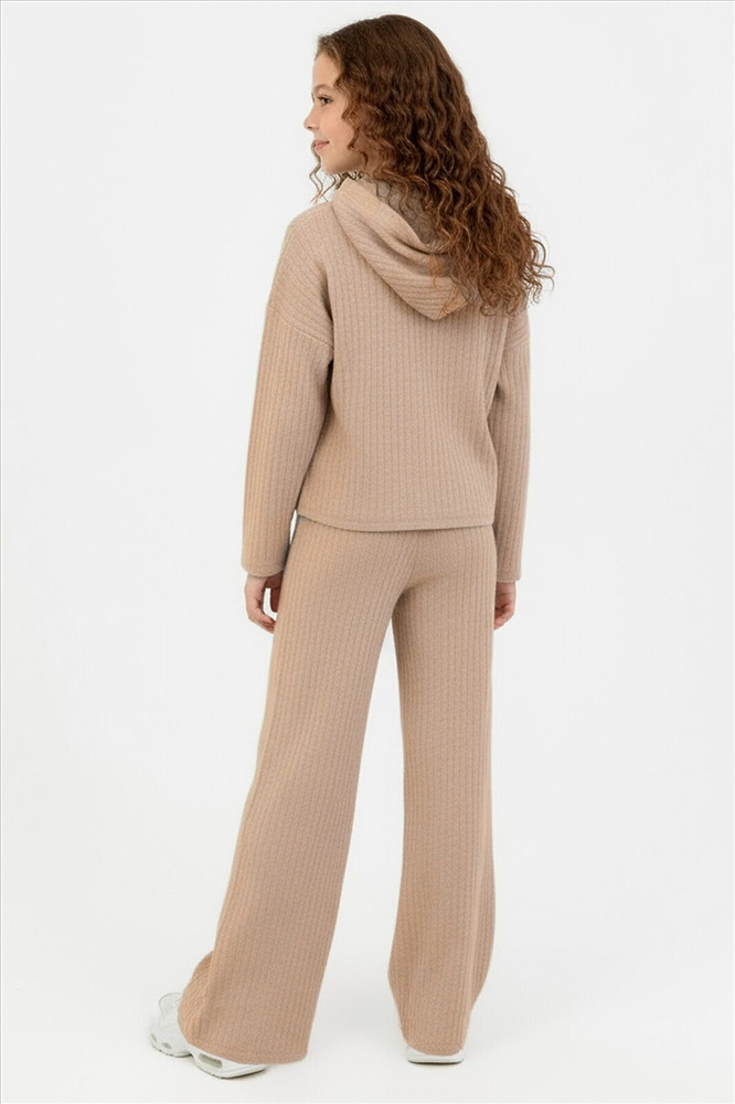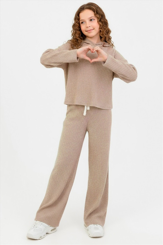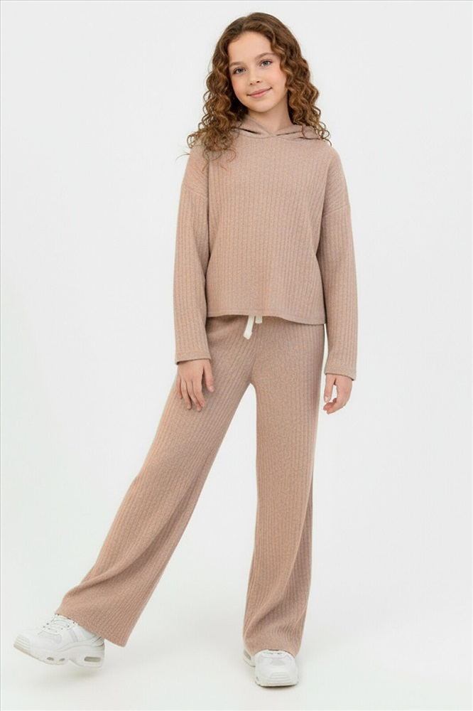 Трикотажный костюм для девочки, состоящий из худи и брюк.