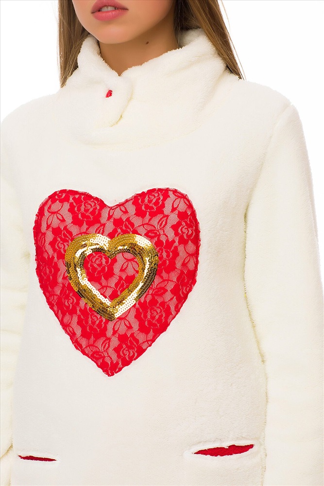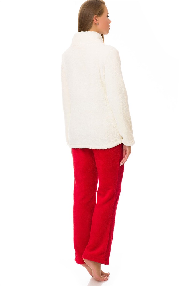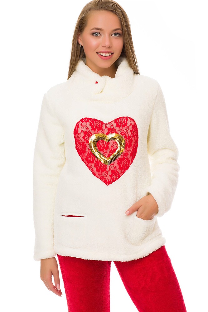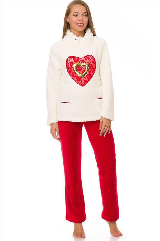 ID товара: 67839 Состав: Полиэстер 100% Сезон: Демисезон Длина: Средняя, Кофта 65 см. по спинке, брюки 75 см. по внутреннему шву Фасон: Прямой Рукав: Длинный, 60 см. Вид застежки: Нет Страна бренда: Турция Страна производства: Турция Теплый и уютный махровый костюм, выполненный из невероятно нежного и мягкого материала. Костюм состоит из кофты прямого кроя, с высоким воротом, прорезными карманами и аппликацией с кружевом и паетками спереди, а также брюк прямого кроя на резинке. Незаменимая вещь для домашнего гардероба. Комментарии к товару