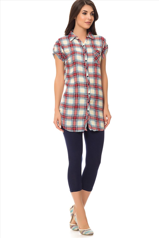 ID товара: 64328 Состав: Хлопок 92%, Эластан 8% Сезон: Весна/Лето Длина: Длинная, 78 см. по спинке, 46 см. по внутреннему шву Фасон: Прямой Рукав: Короткий, 20 см. по внешней стороне Вид застежки: Пуговицы Страна бренда: Турция Страна производства: Турция Комплект из лосин облегающего кроя и рубашки в клетку с коротким рукавом и отложным воротничком. Комментарии к товару